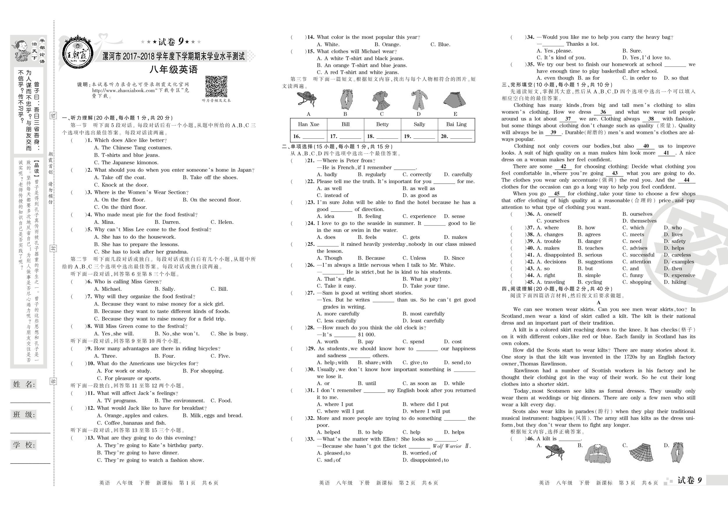 2017-2018学年第二学期漯河市八年级英语试卷(新课版)【9】