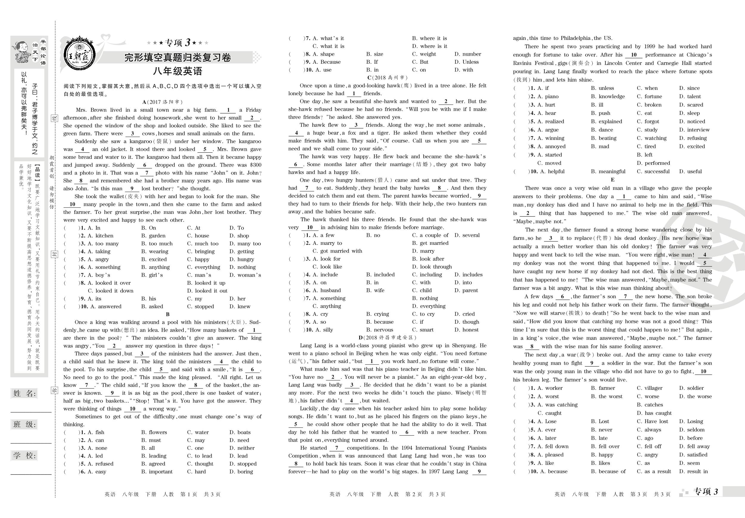 王朝霞期末专项卷——完形填空真题归类复习、选择型阅读真题归类复习八年级下册英语(人教版)_R210809113016【0】