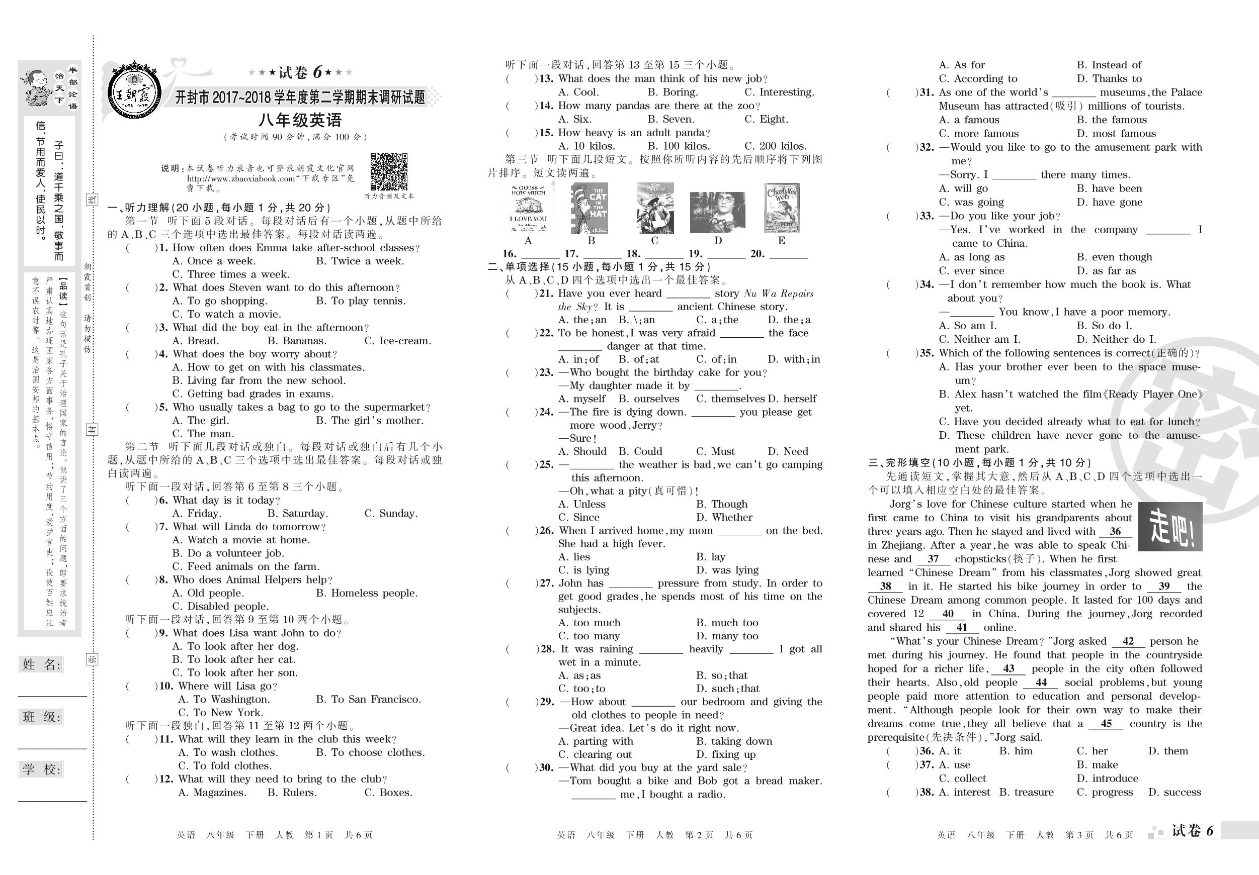 2017-2018学年第二学期开封市八年级英语试卷(人教版)【6】