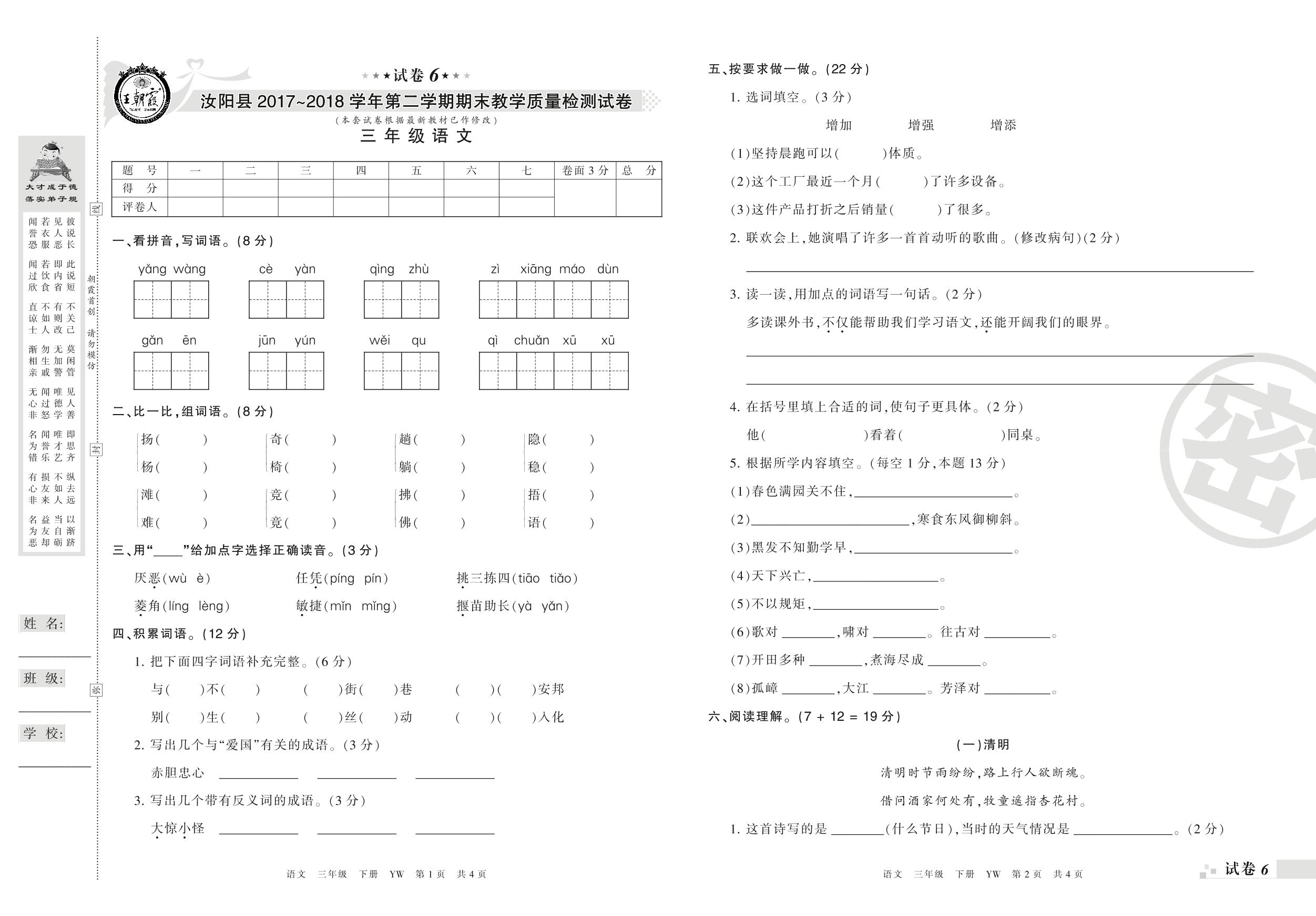 2017-2018学年第二学期洛阳市汝阳县三年级语文试卷(语文版)【6】