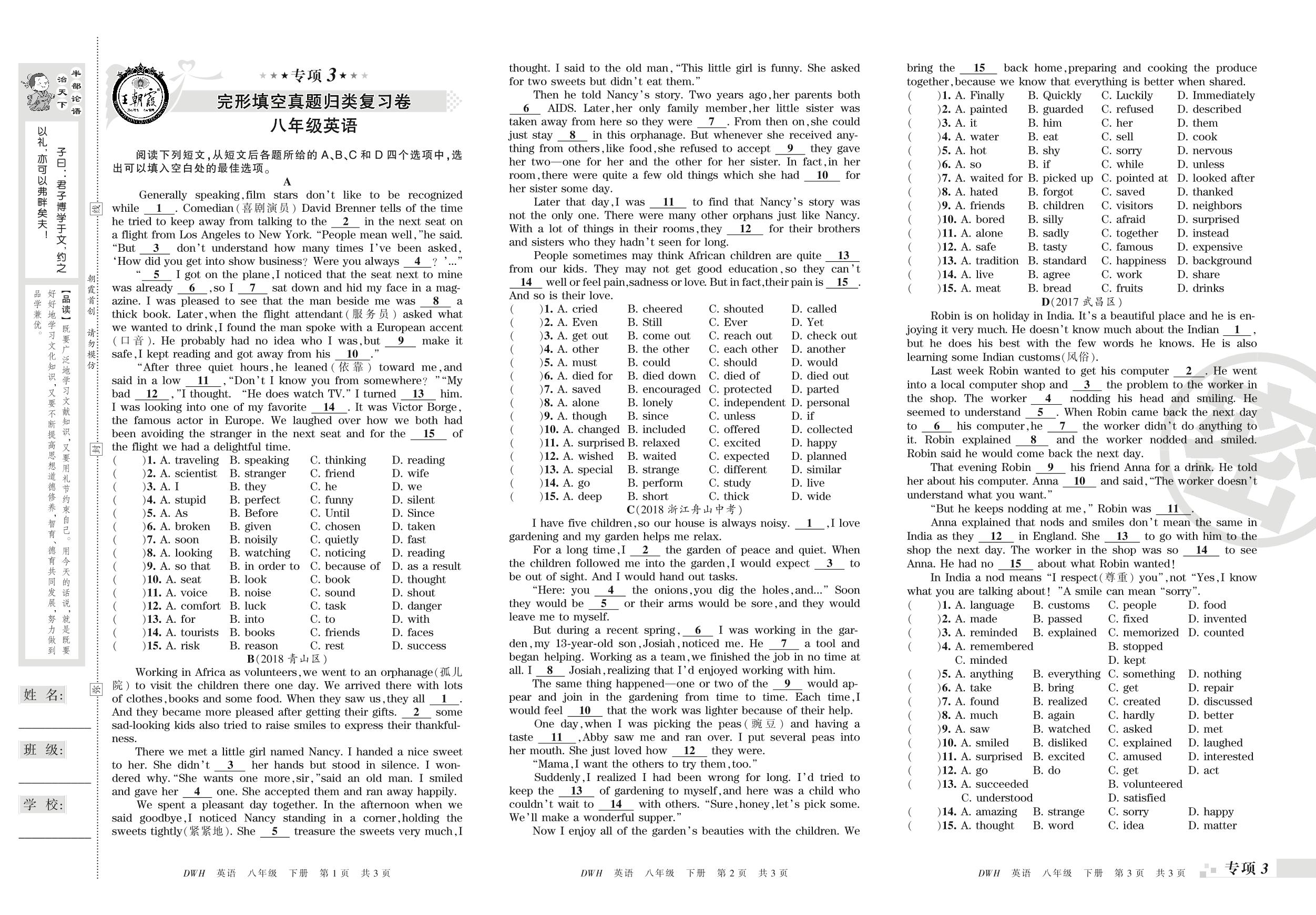 王朝霞期末专项卷——完形填空真题归类复习、阅读理解真题归类复习(一)八年级下册英语(人教版)【0】