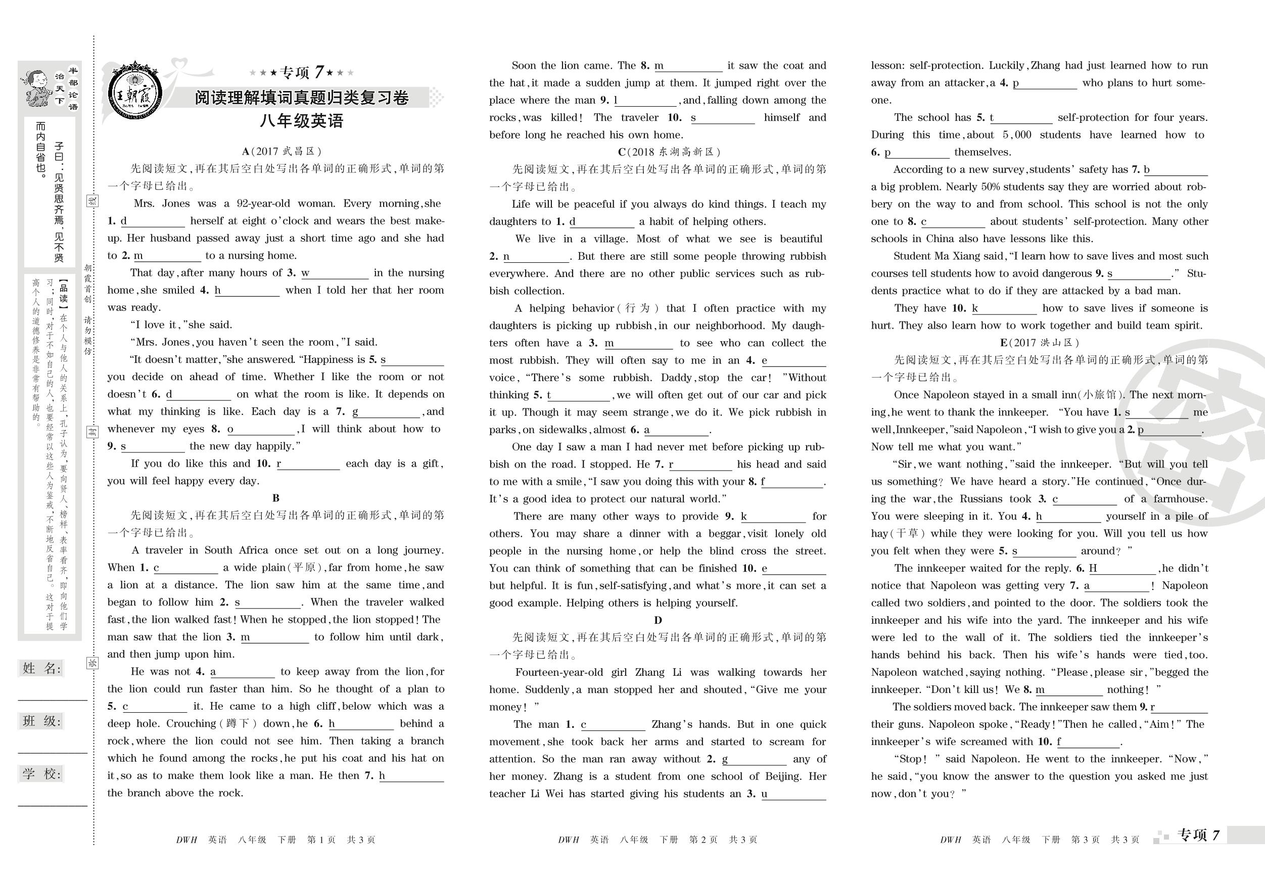 王朝霞期末专项卷——阅读理解填词真题归类复习、书面表达真题归类复习八年级下册英语(人教版)【0】