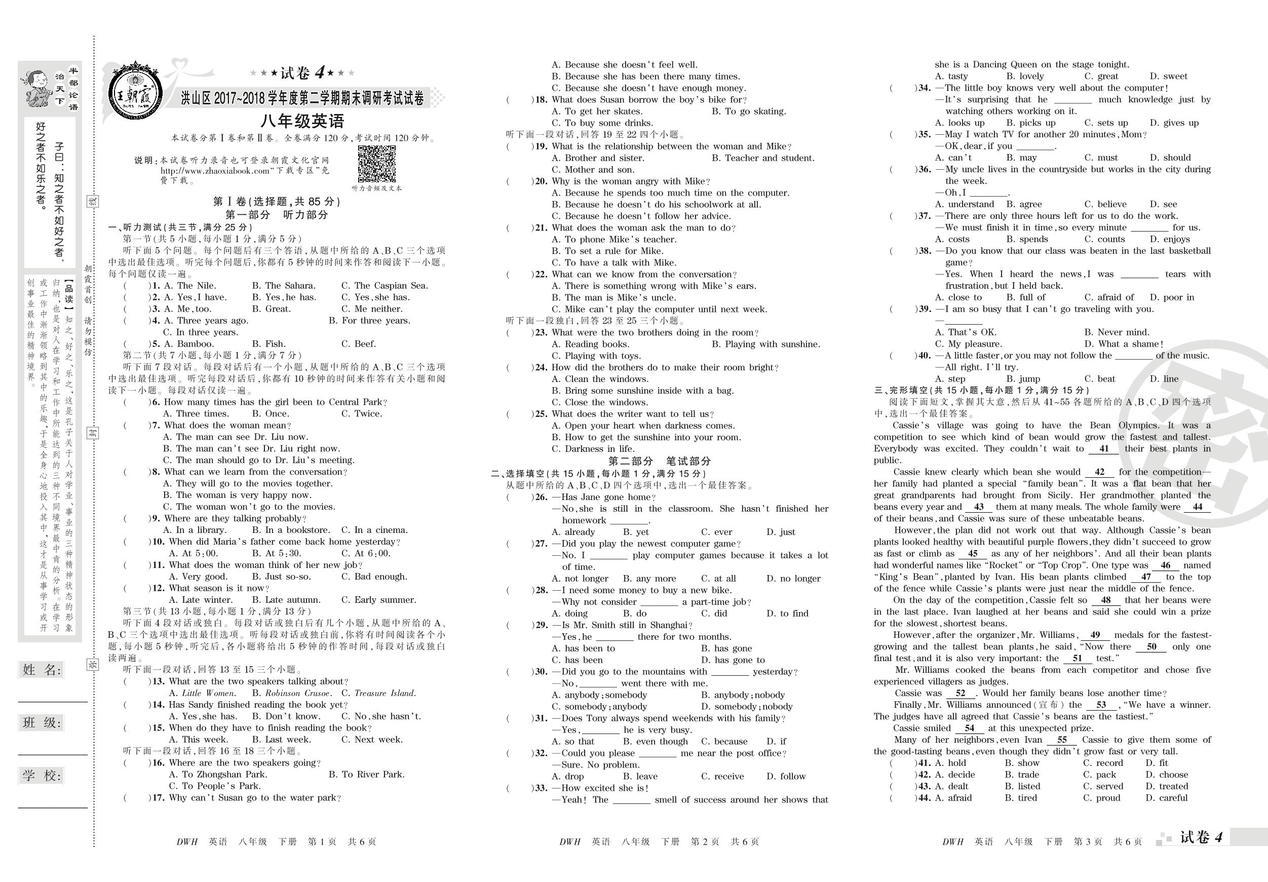 2017-2018学年第二学期武汉市洪山区八年级英语试卷(人教版)【4】