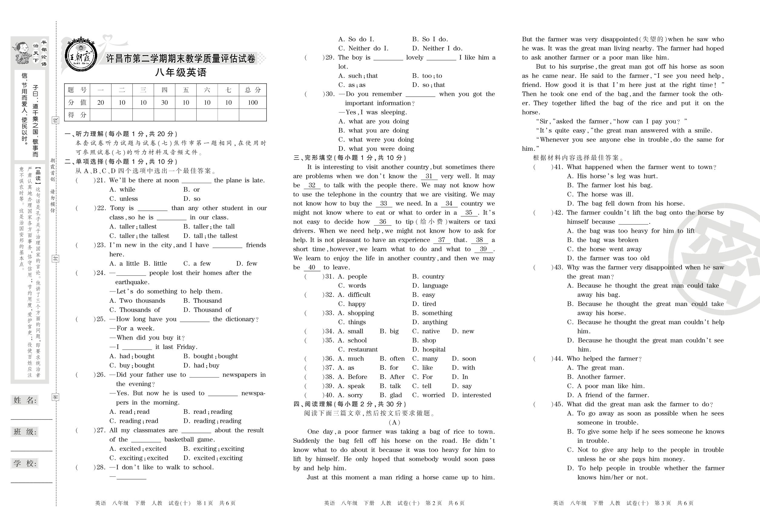 2015-2016学年第二学期许昌市八年级英语试卷(人教版)【10】