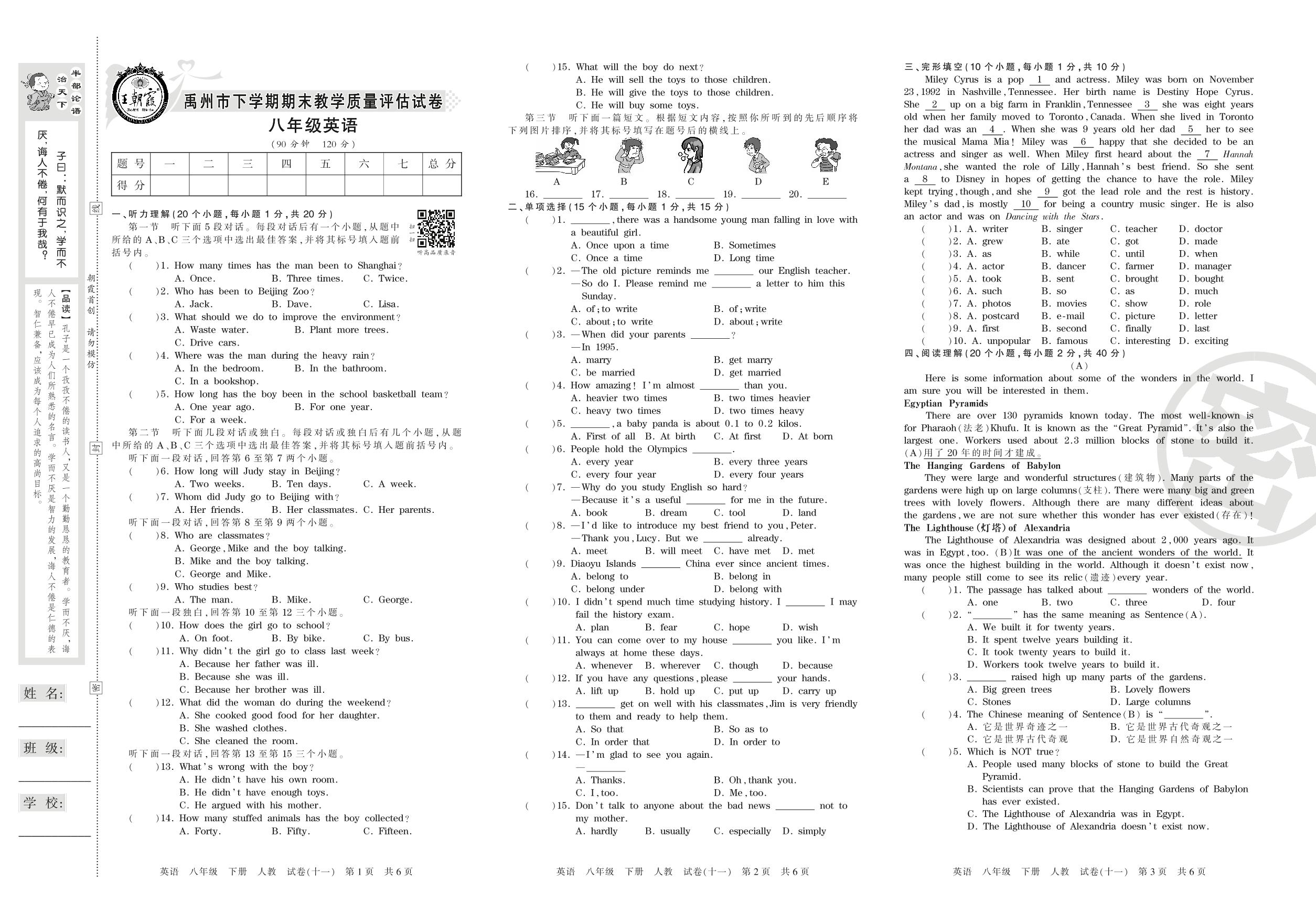 2015-2016学年第二学期禹州市八年级英语试卷(人教版)【11】