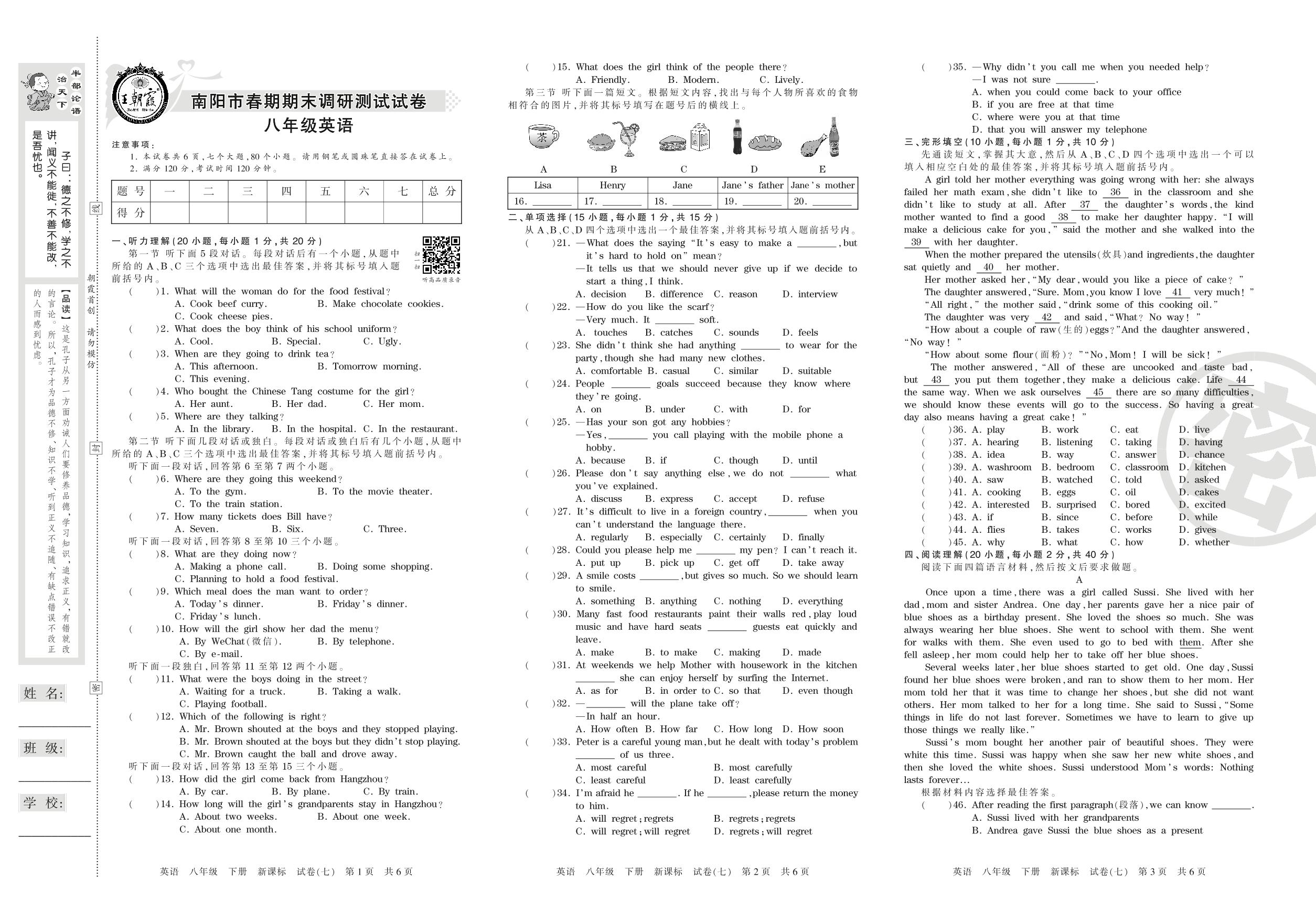 2015-2016学年第二学期南阳市八年级英语试卷(新课版)【7】
