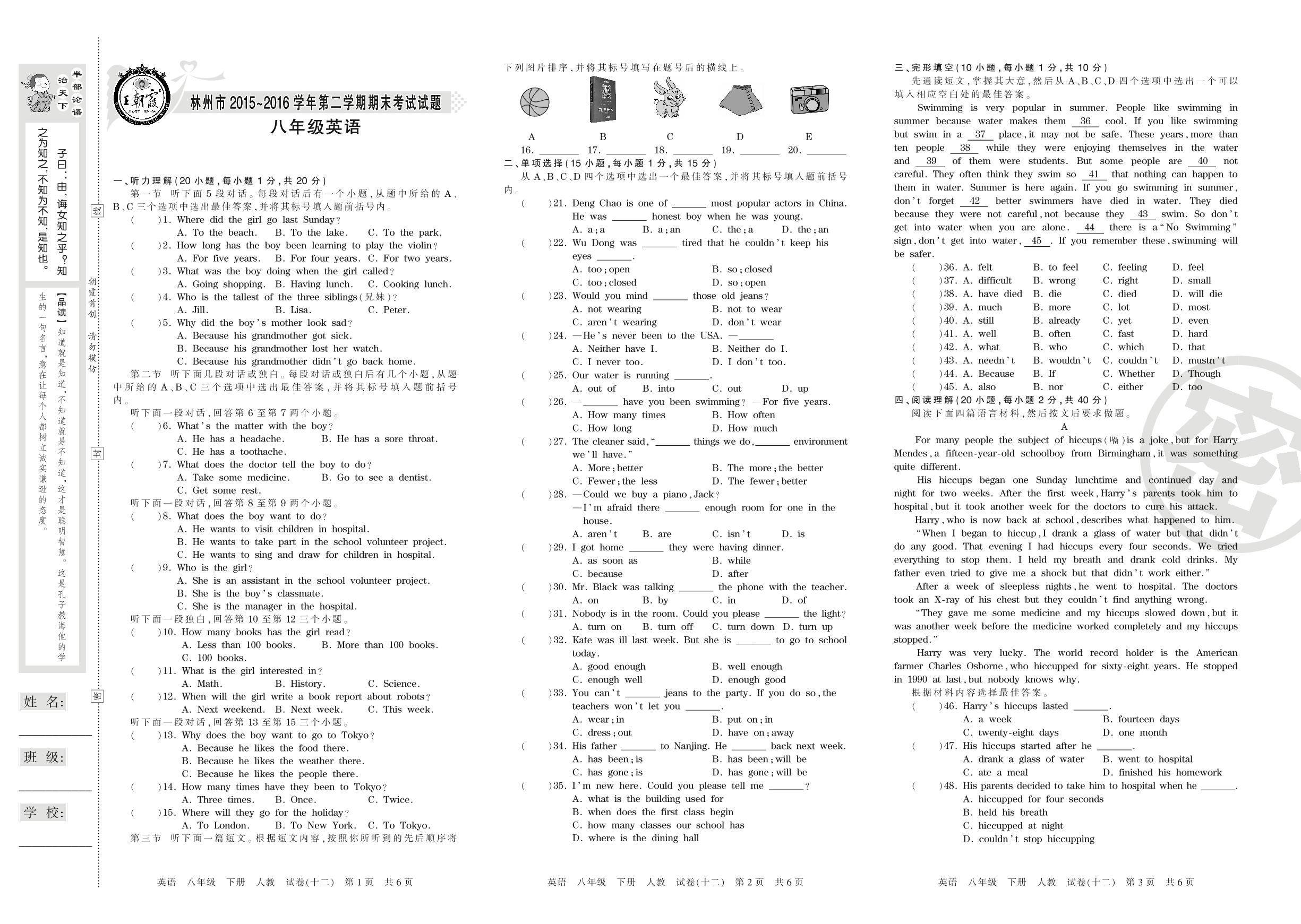 2015-2016学年第二学期林州市八年级英语试卷(人教版)【12】