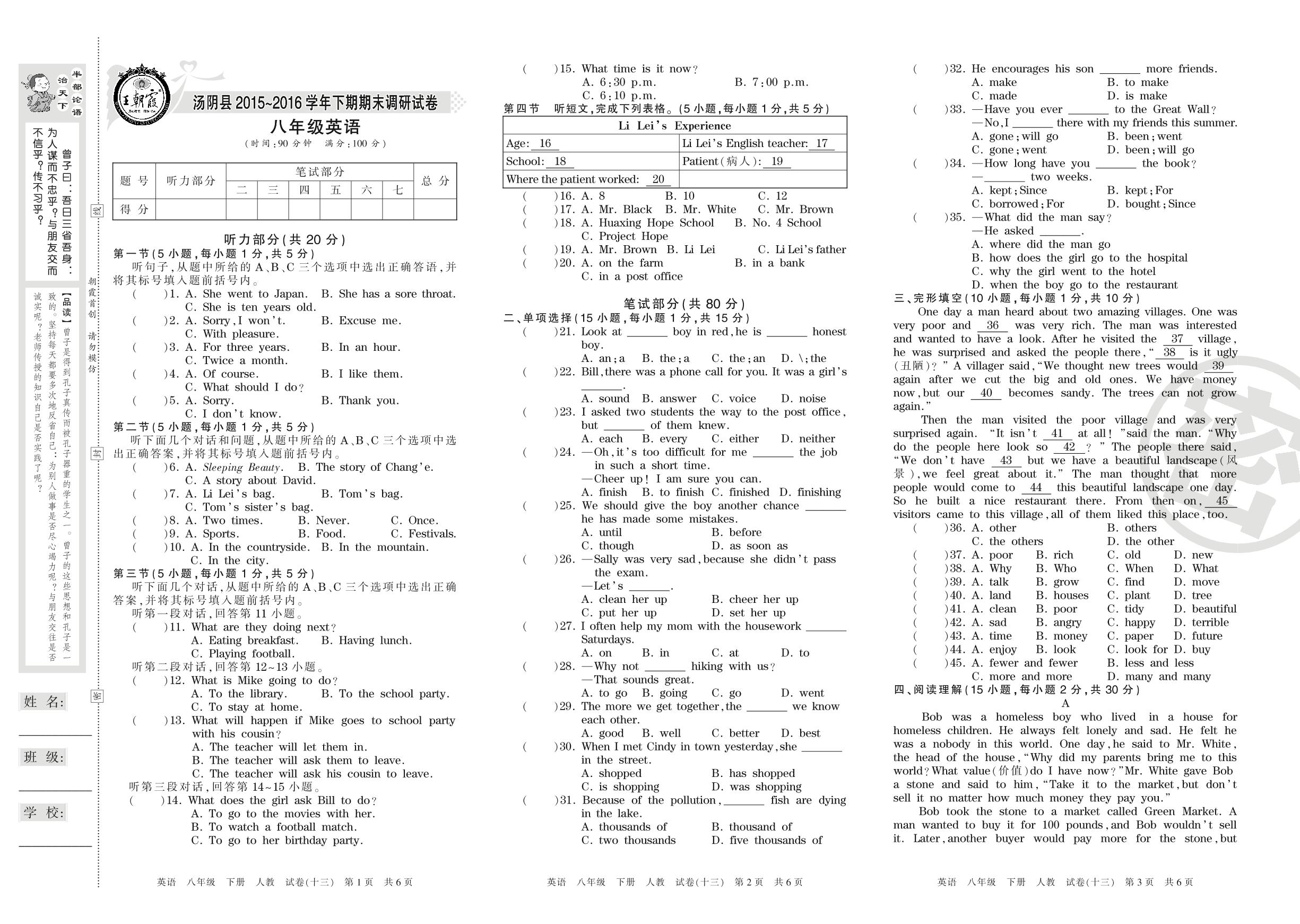 2015-2016学年第二学期安阳市汤阴县八年级英语试卷(人教版)【13】