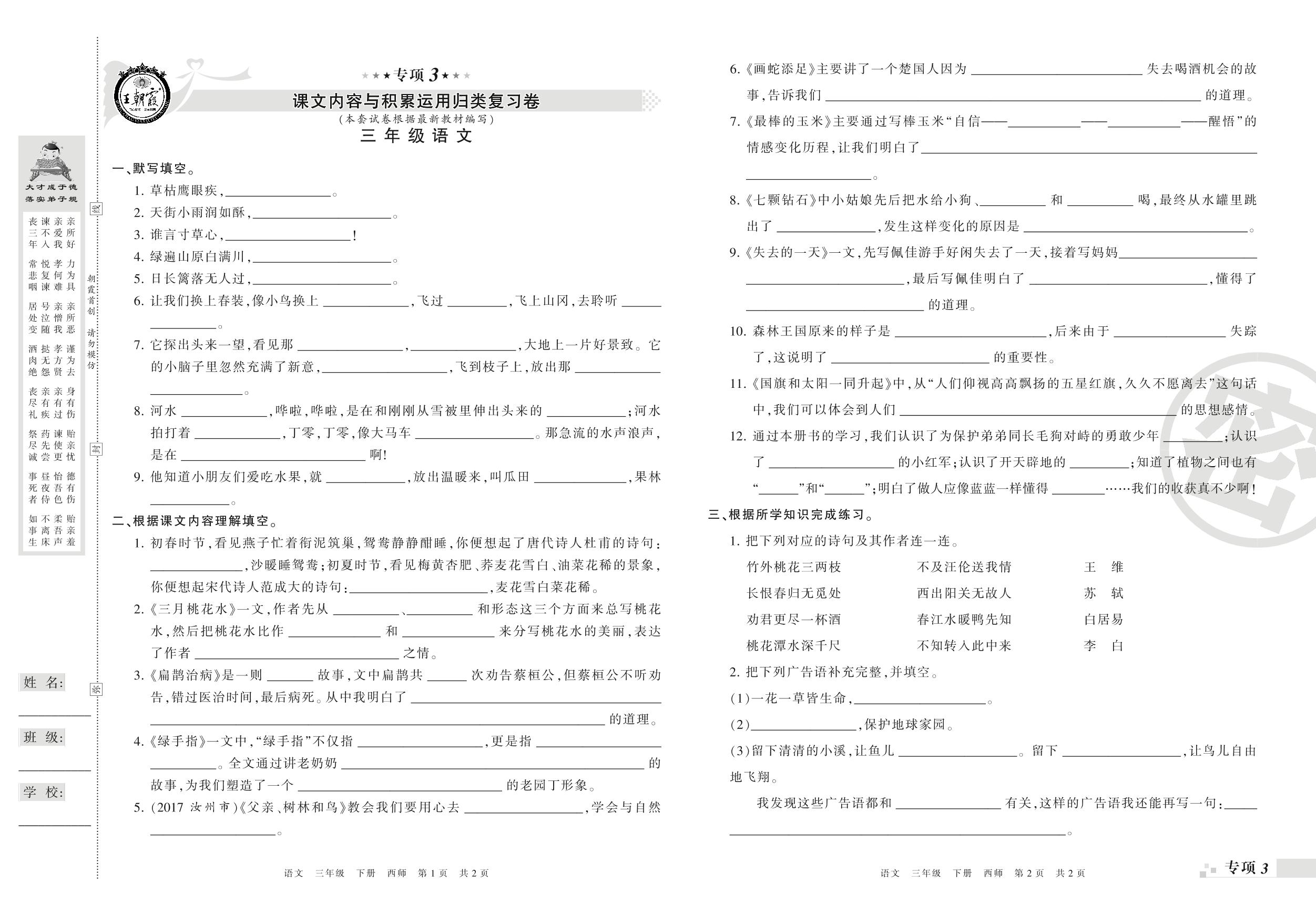 王朝霞期末专项卷——课文内容与积累运用、课内阅读与写作归类复习三年级下册语文(西师版)_R21080191633【0】