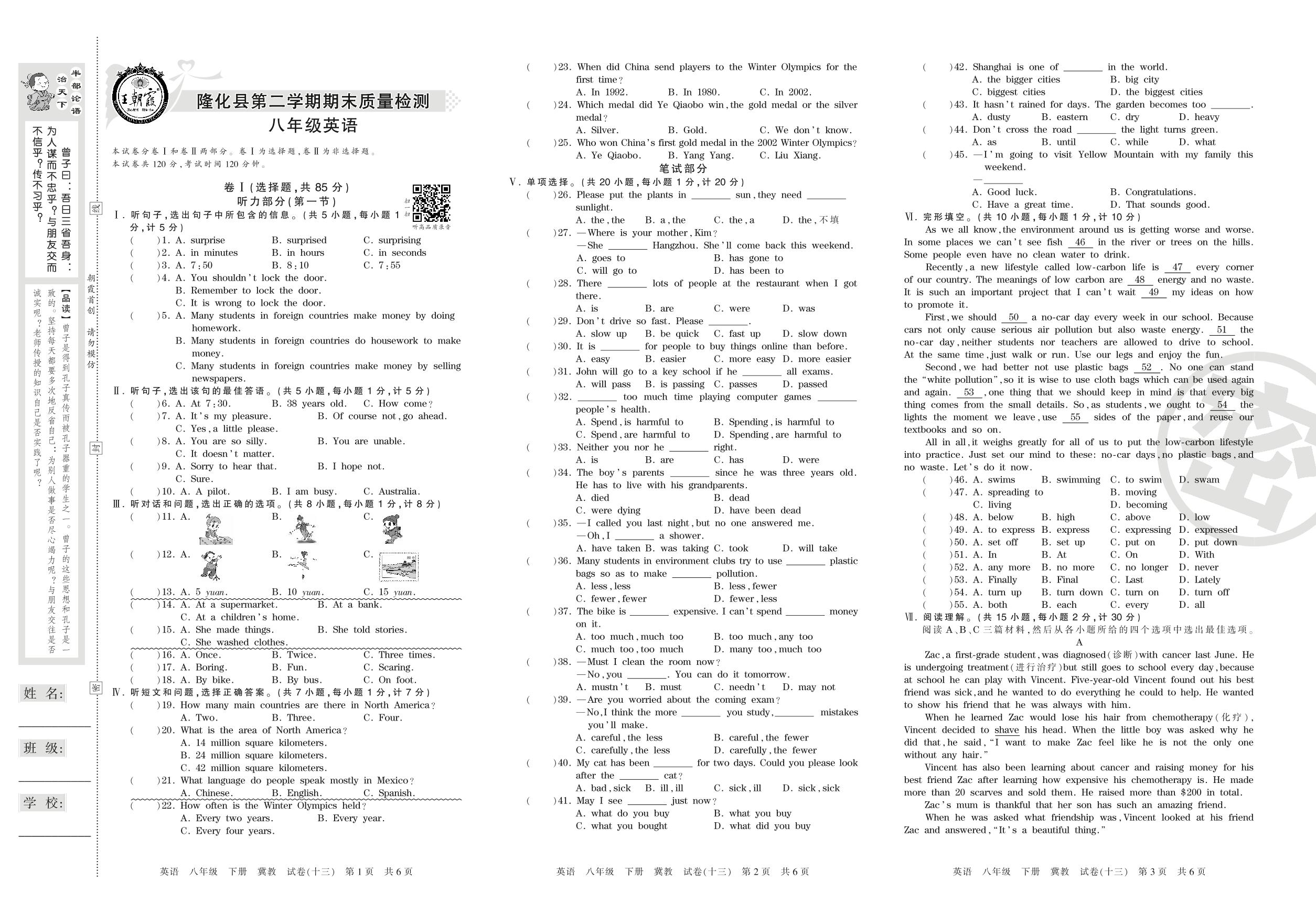 2015-2016学年第二学期承德市隆化县八年级英语试卷(冀教版)【13】