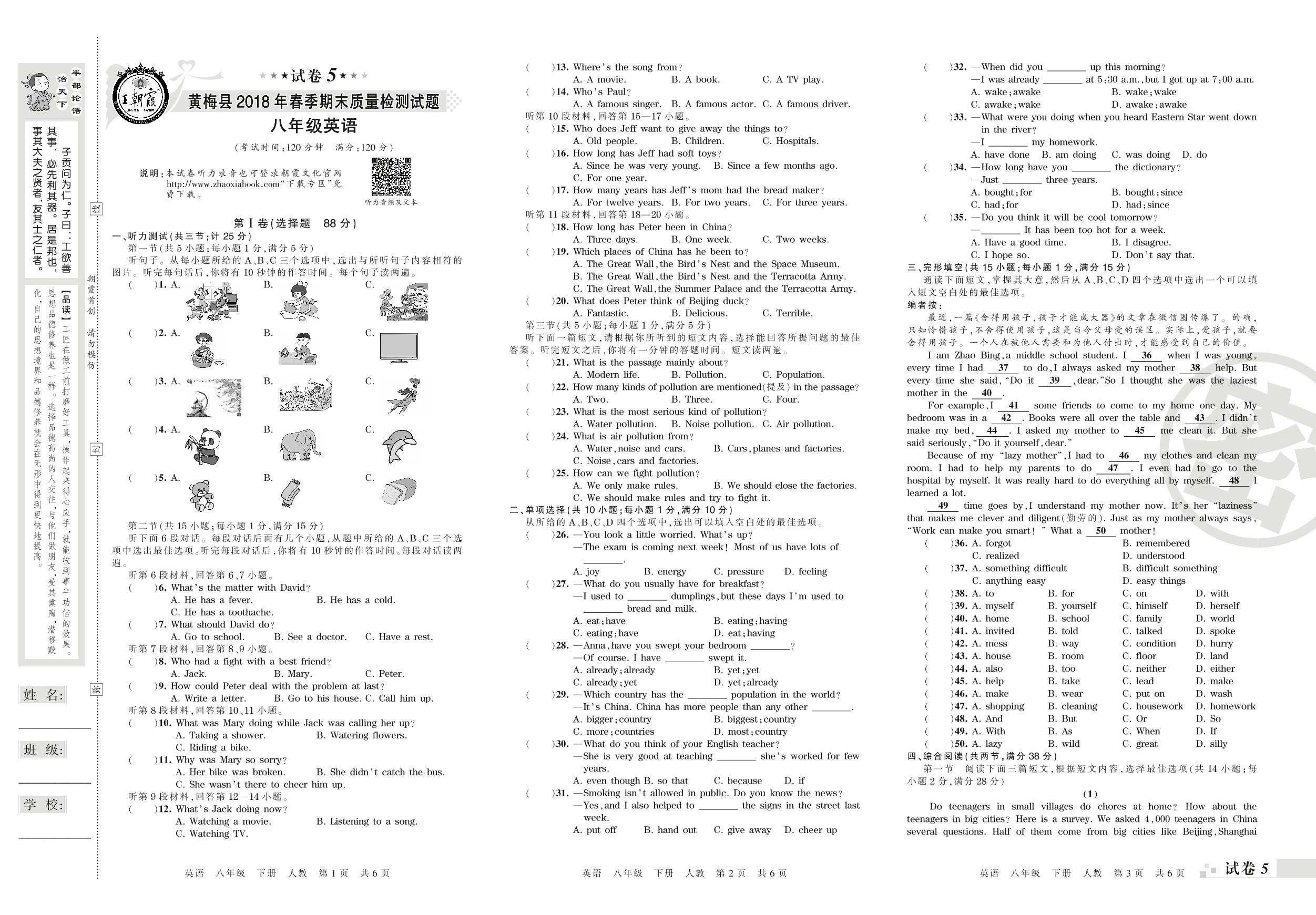 2017-2018学年第二学期黄冈市黄梅县八年级英语试卷(人教版)【5】