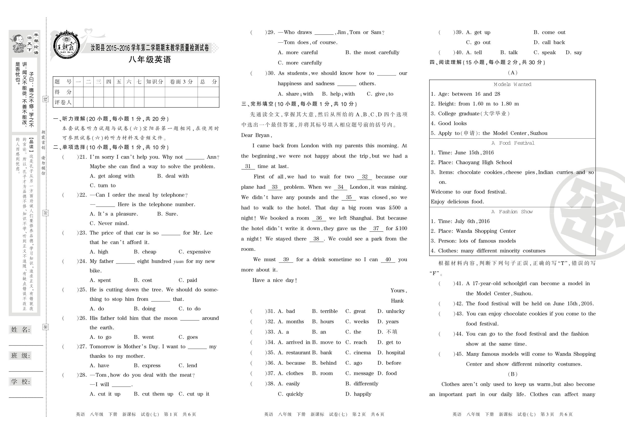 2015-2016学年第二学期洛阳市汝阳县八年级英语试卷(新课版)【7】