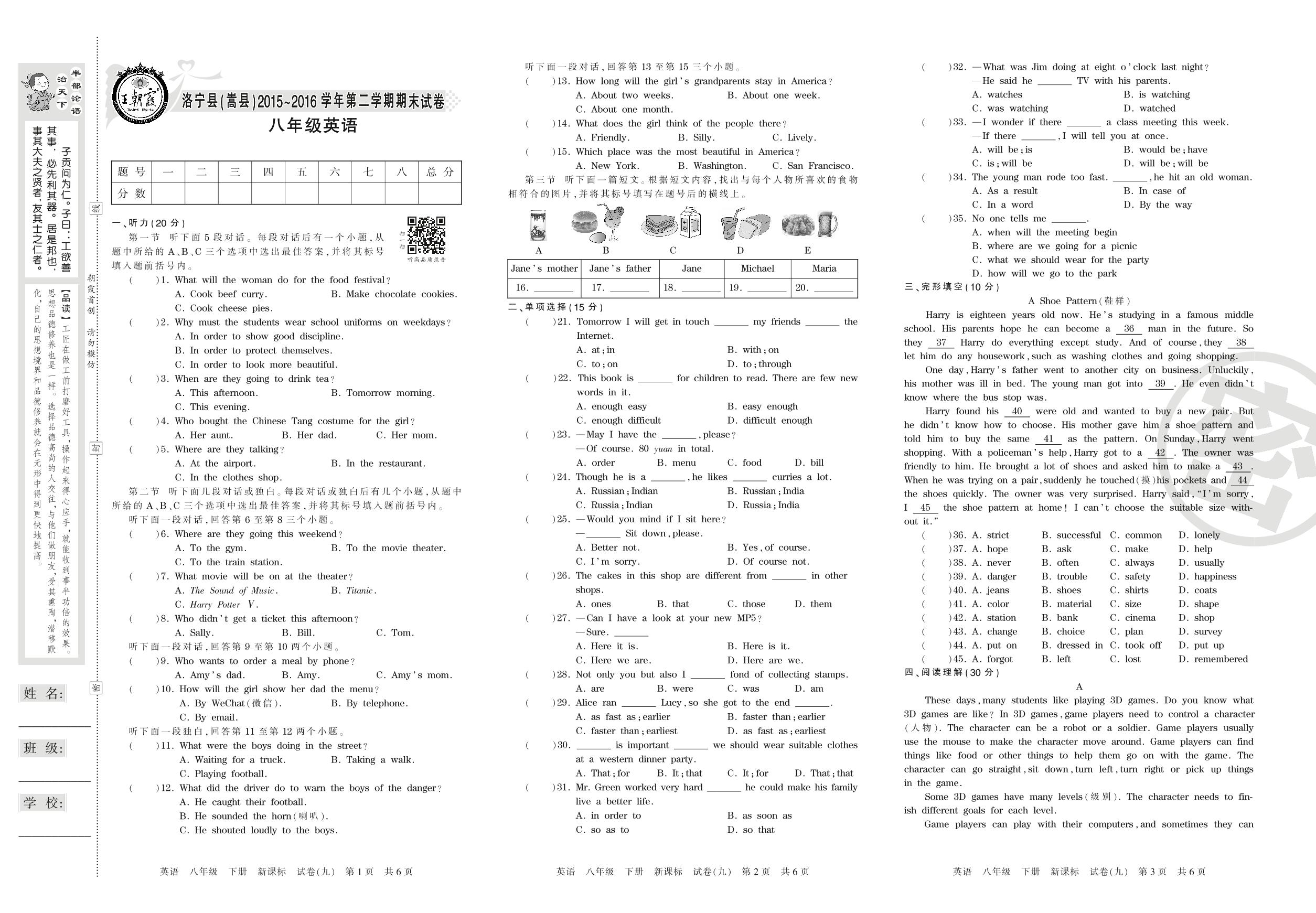 2015-2016学年第二学期洛阳市洛宁县(嵩县)八年级英语试卷(新课版)【9】