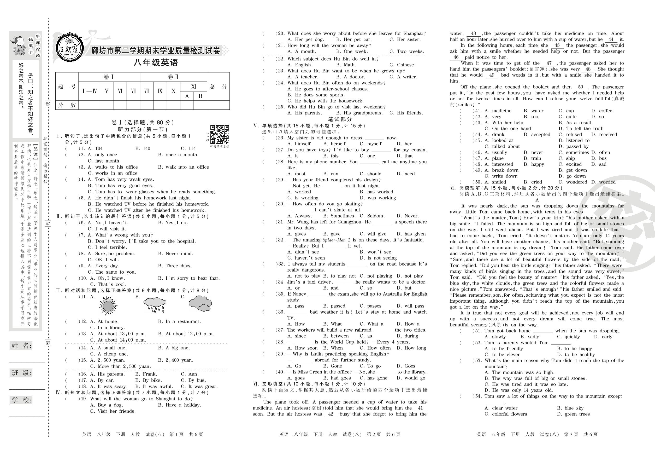 2015-2016学年第二学期廊坊市八年级英语试卷(人教版)【8】