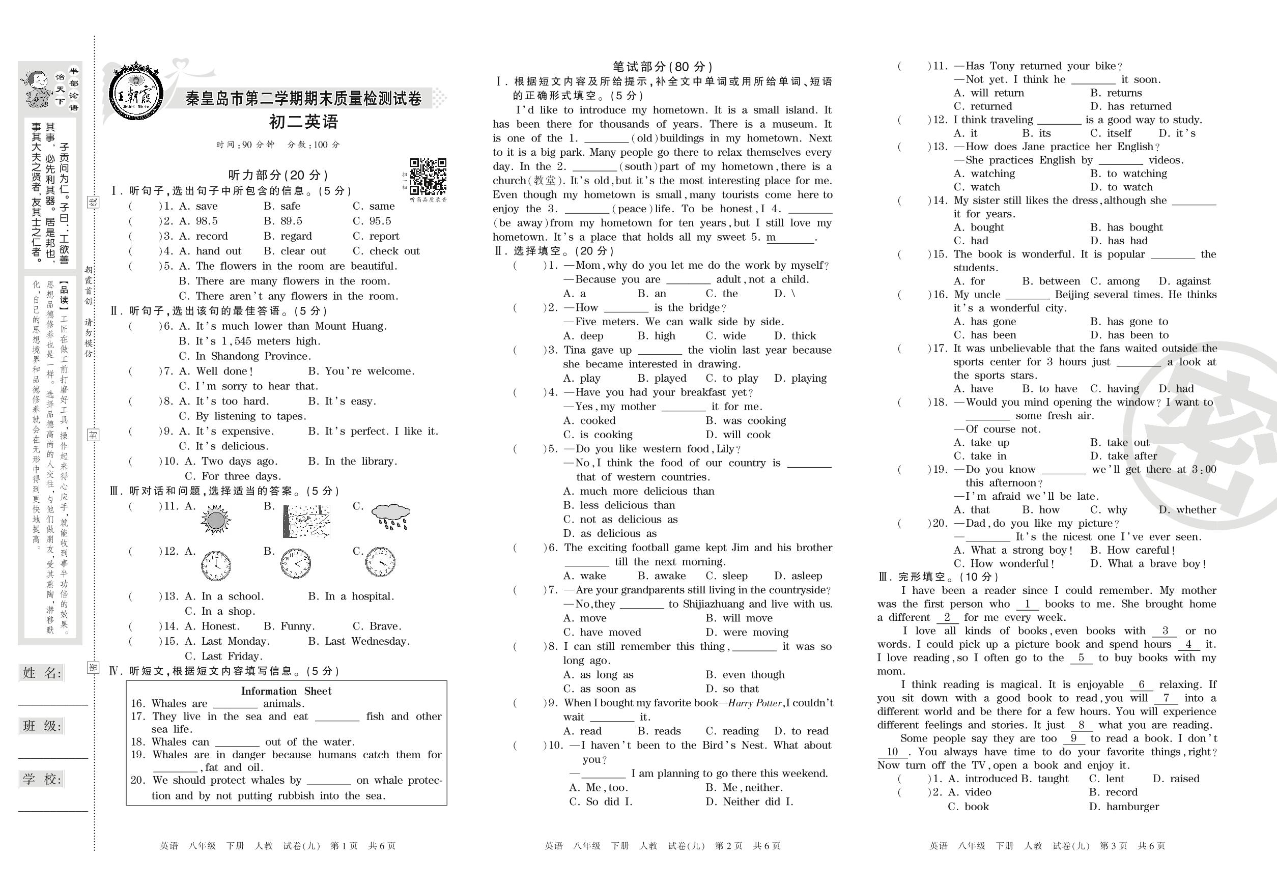 2015-2016学年第二学期秦皇岛市八年级英语试卷(人教版)【9】