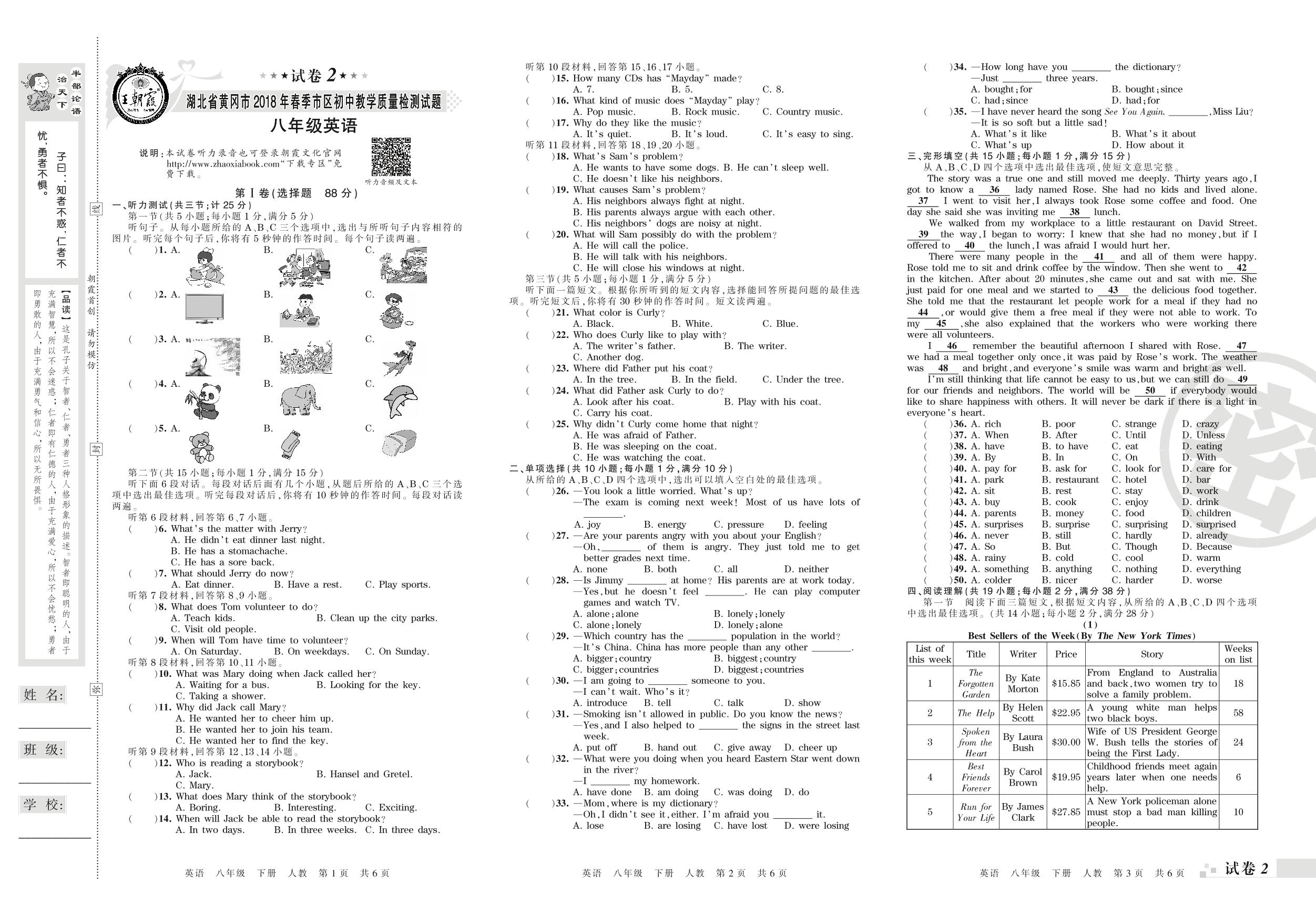 2017-2018学年第二学期湖北省黄冈市八年级英语试卷(人教版)【2】