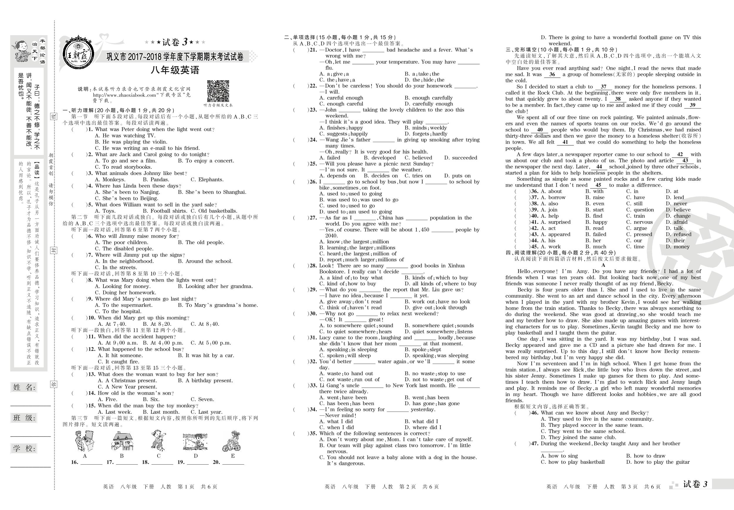 2017-2018学年第二学期巩义市八年级英语试卷(人教版)【3】
