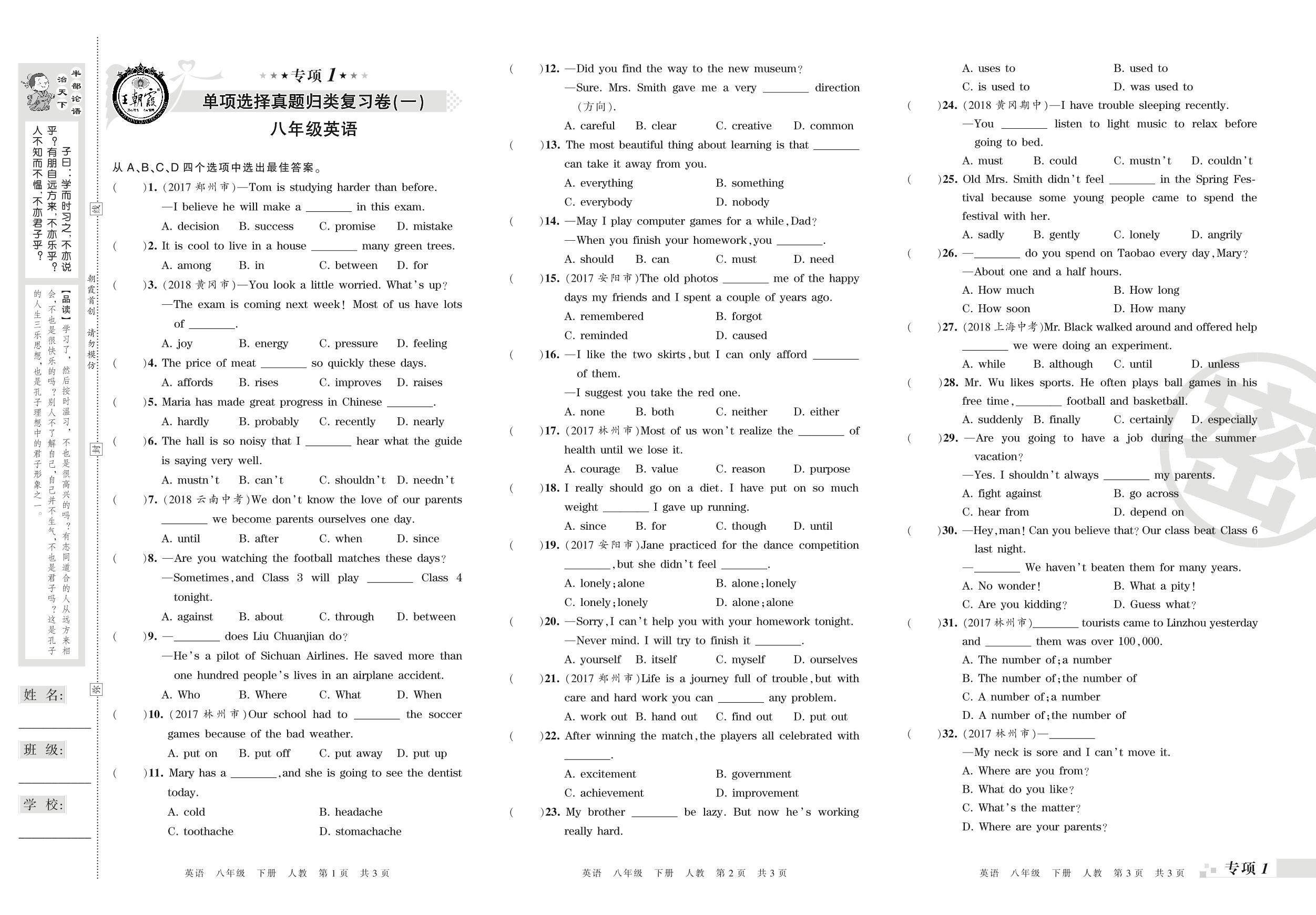 王朝霞期末专项卷——单项选择真题归类复习(一)、单项选择真题归类复习(二)八年级下册英语(人教版)【0】