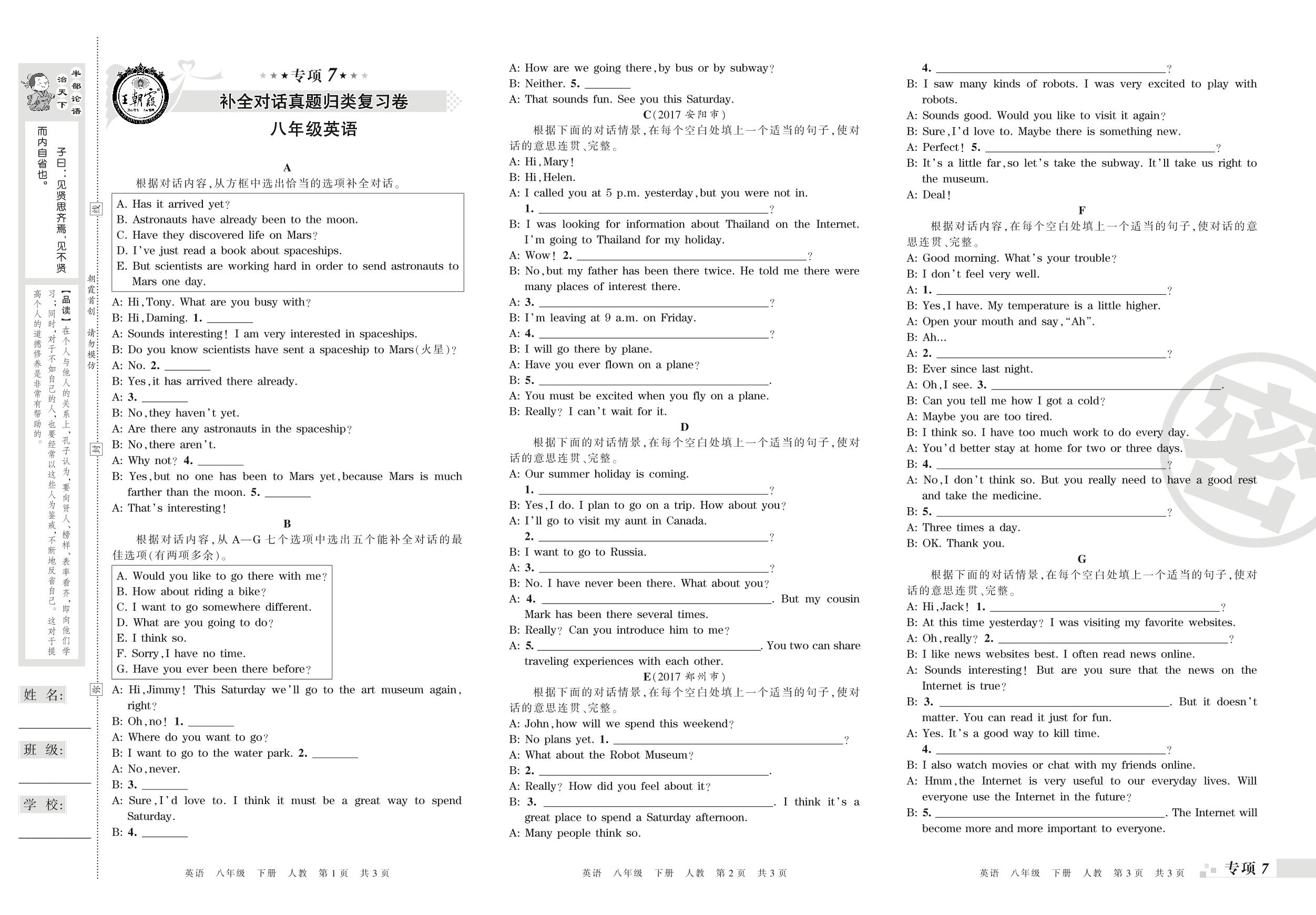 王朝霞期末专项卷——补全对话真题归类复习、书面表达真题归类复习八年级下册英语(人教版)【0】