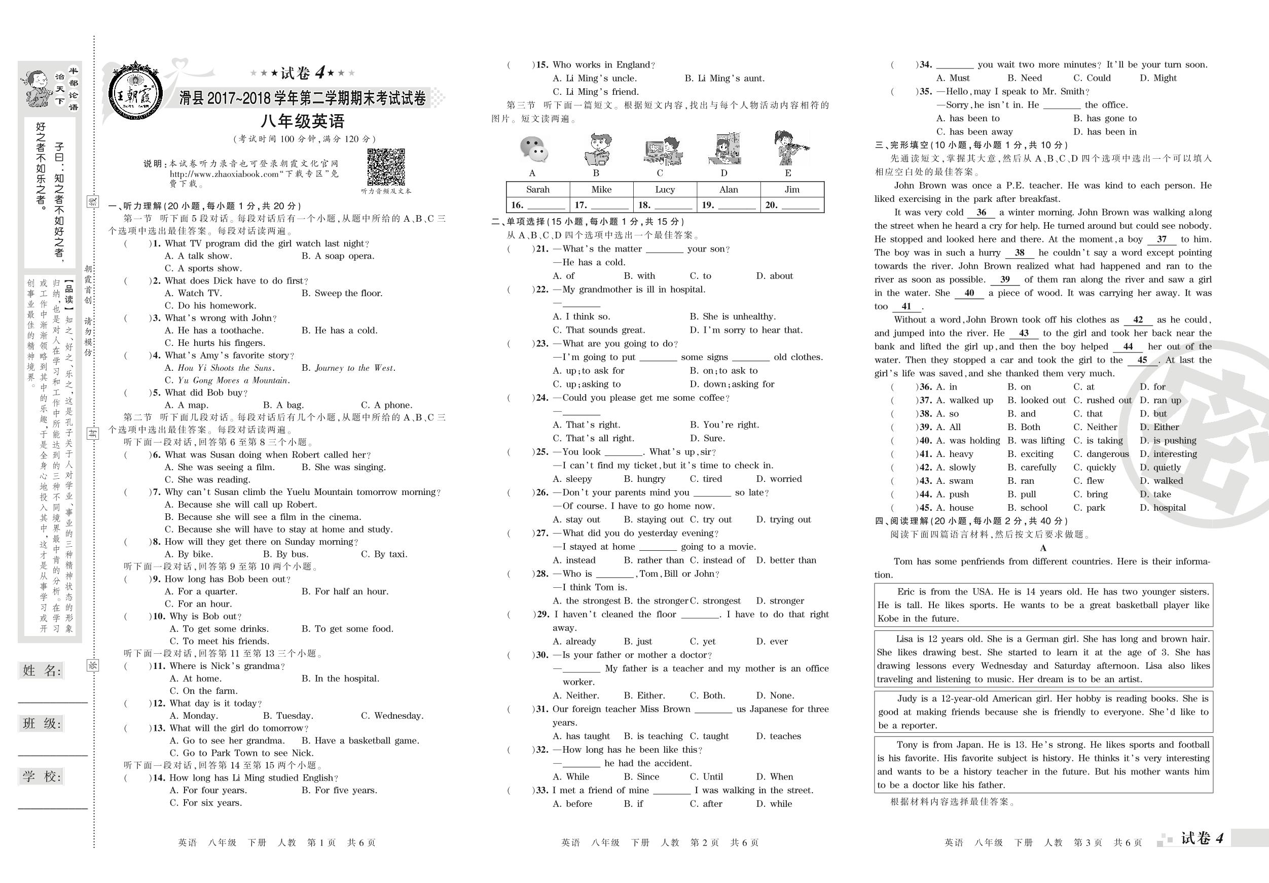 2017-2018学年第二学期安阳市滑县八年级英语试卷(人教版)【4】