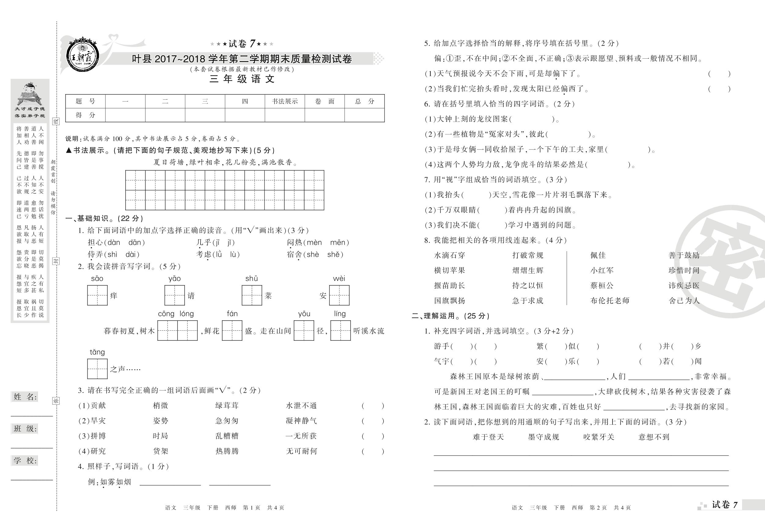 2017-2018学年第二学期平顶山市叶县三年级语文试卷(西师版)【7】
