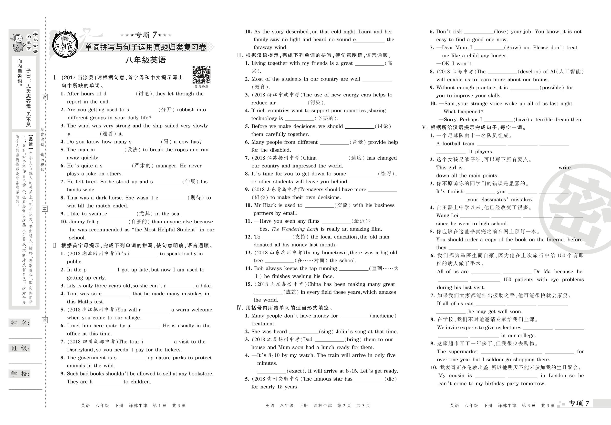 王朝霞期末专项卷——单词拼写与句子运用真题归类复习、书面表达真题归类复习八年级下册英语(译林版)【0】