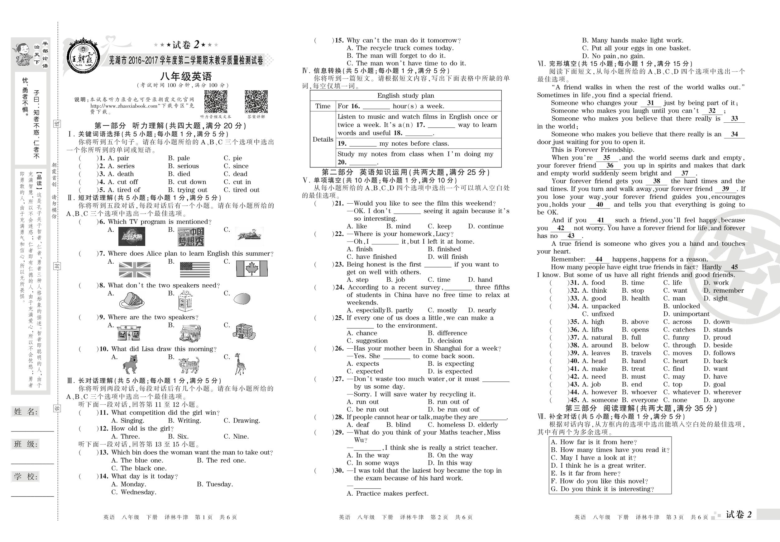 2016-2017学年第二学期芜湖市八年级英语试卷(译林版)【2】