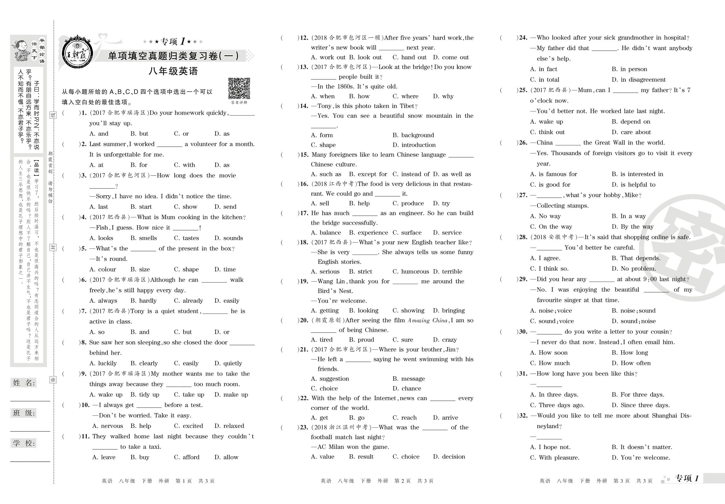 王朝霞期末专项卷——单项填空真题归类复习(一)、单项填空真题归类复习(二)八年级下册英语(外研版)【0】