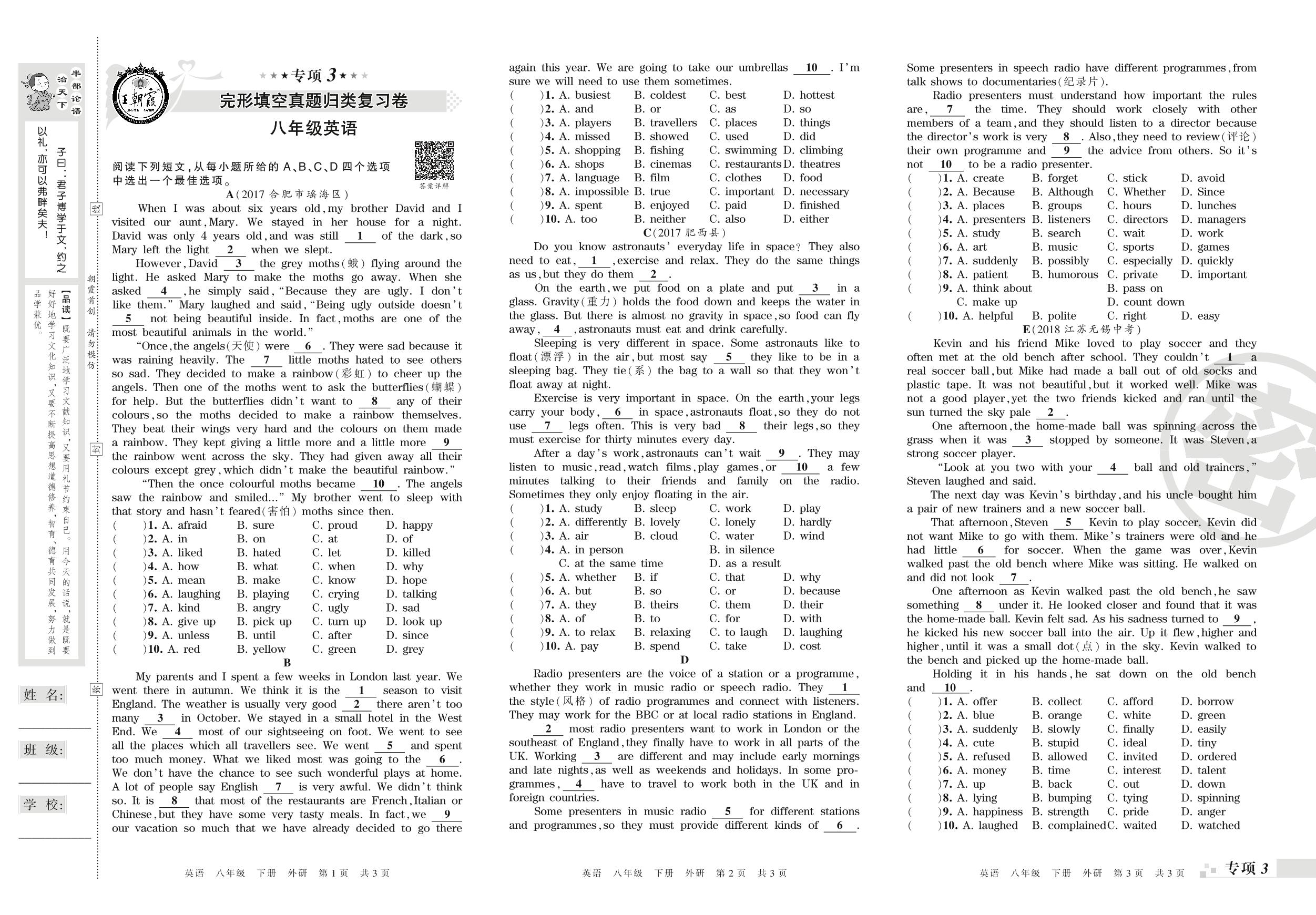 王朝霞期末专项卷——完形填空真题归类复习、任务型阅读真题归类复习八年级下册英语(外研版)【0】