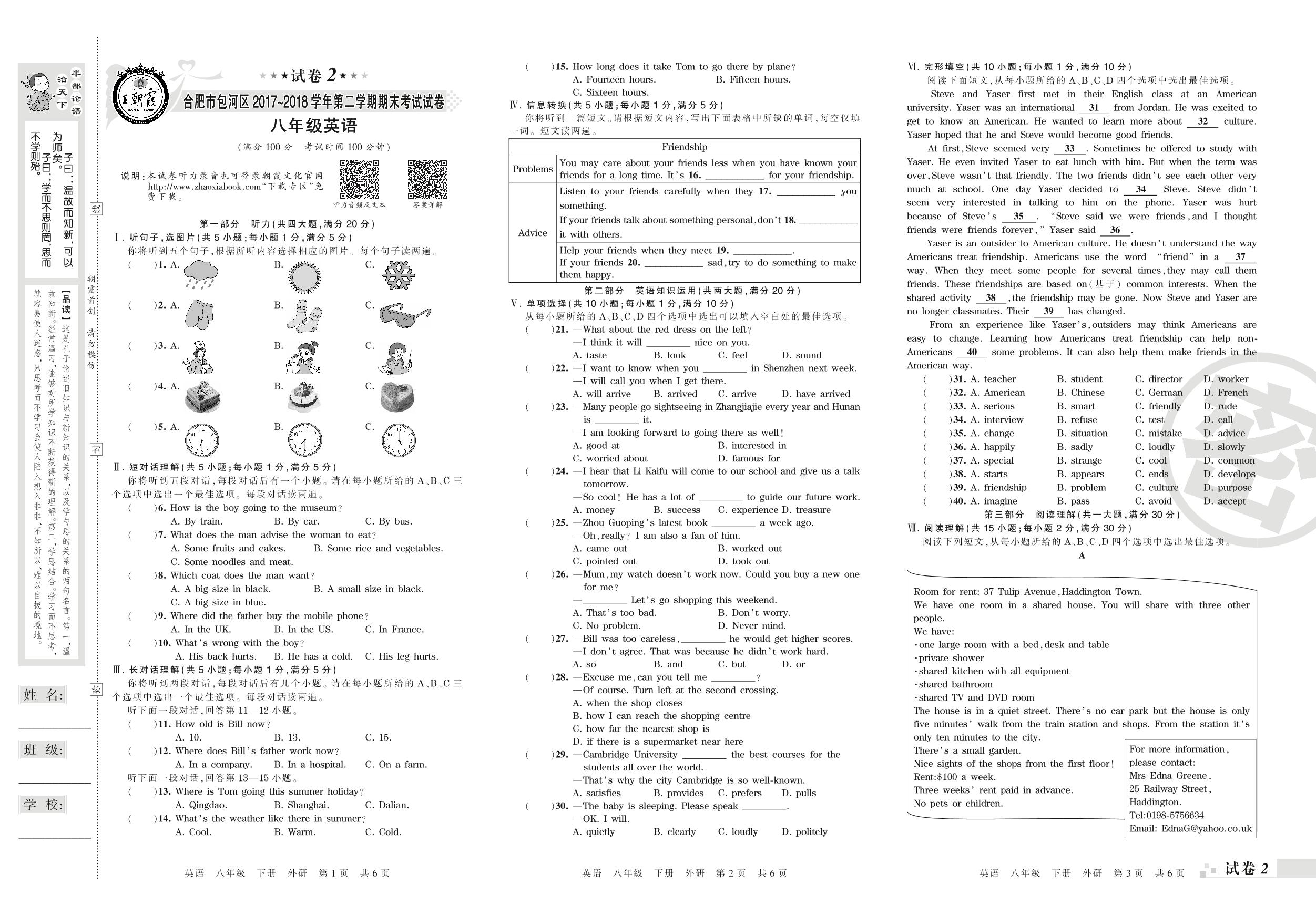 2017-2018学年第二学期合肥市包河区八年级英语试卷(外研版)【2】