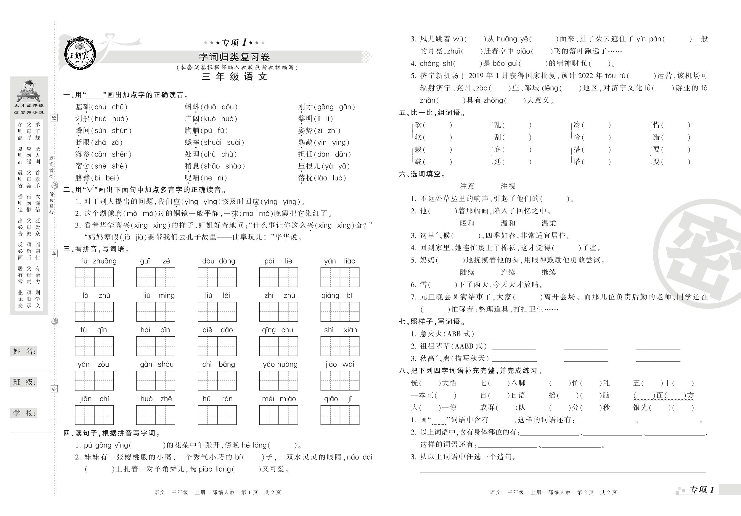 王朝霞期末专项卷——字词、句子与口语交际真题归类复习卷三年级上册语文(人教版)_R21080191707【0】