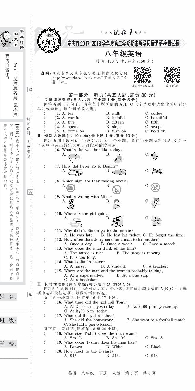 2017-2018学年第二学期安庆市八年级英语试卷(人教版)【1】