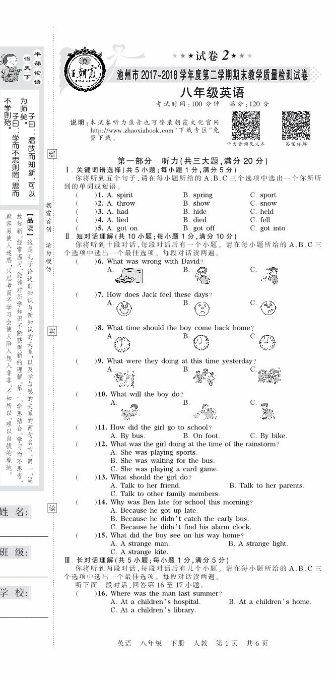 2017-2018学年第二学期池州市八年级英语试卷(人教版)【2】
