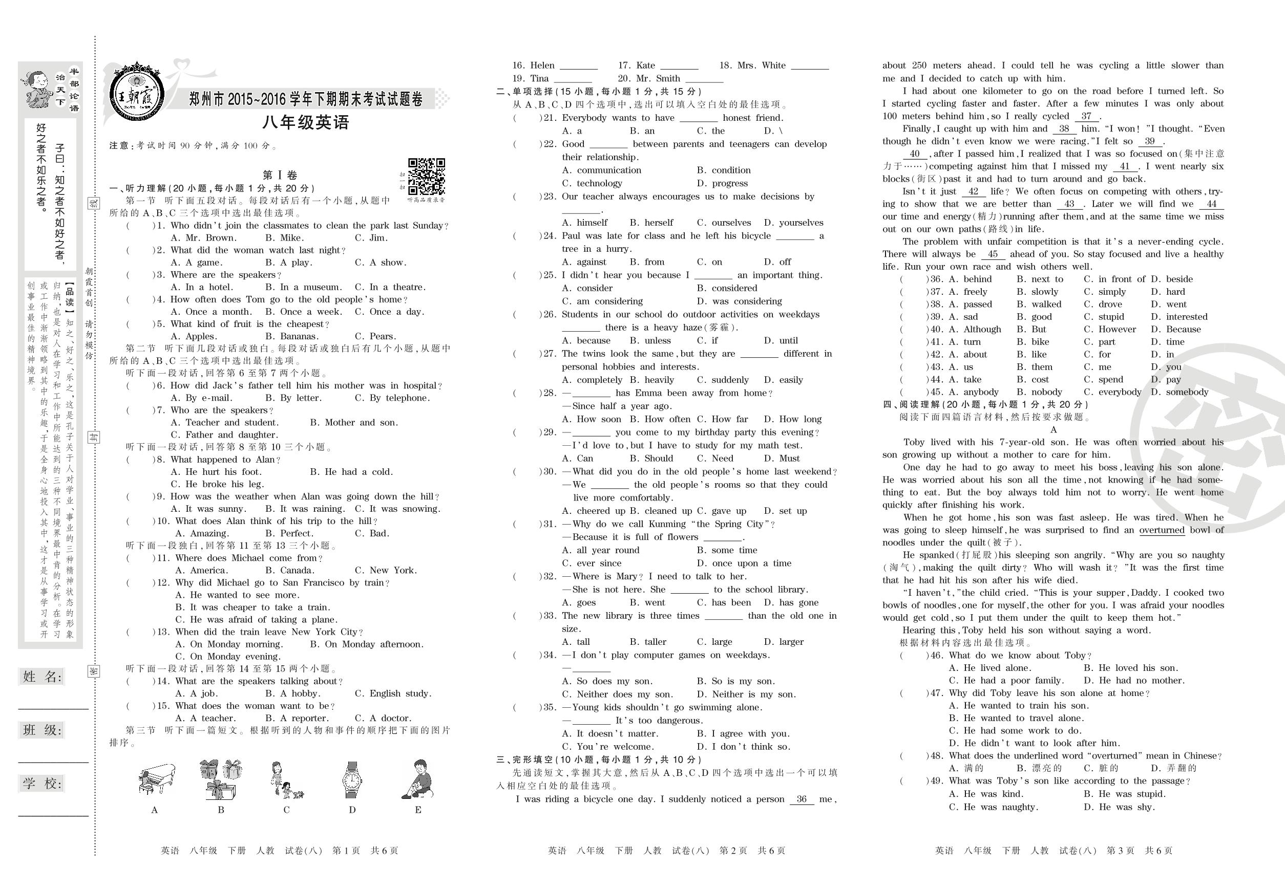 2015-2016学年第二学期郑州市八年级英语试卷(人教版)_R210809120103【8】