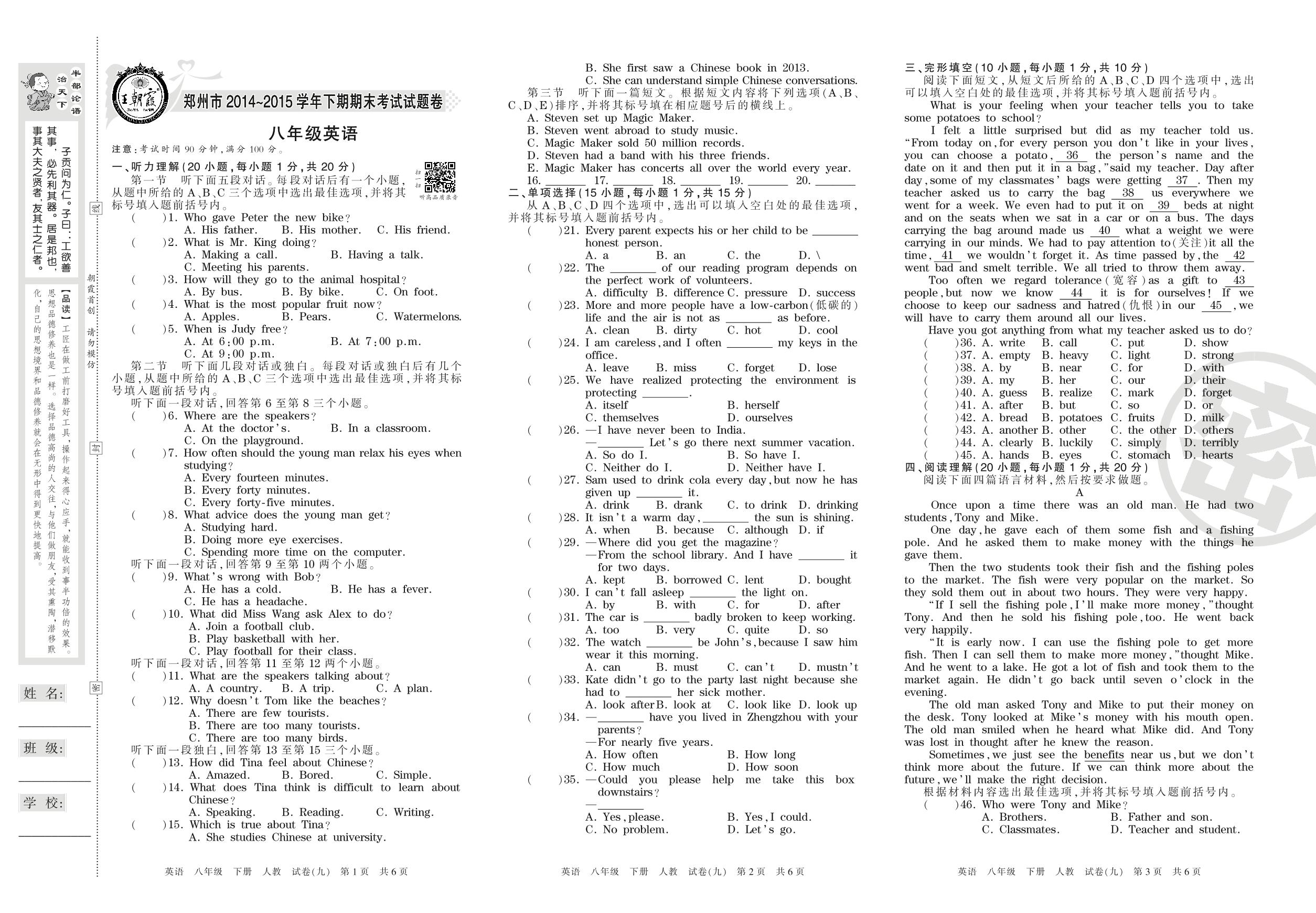 2014-2015学年第二学期郑州市八年级英语试卷(人教版)【9】