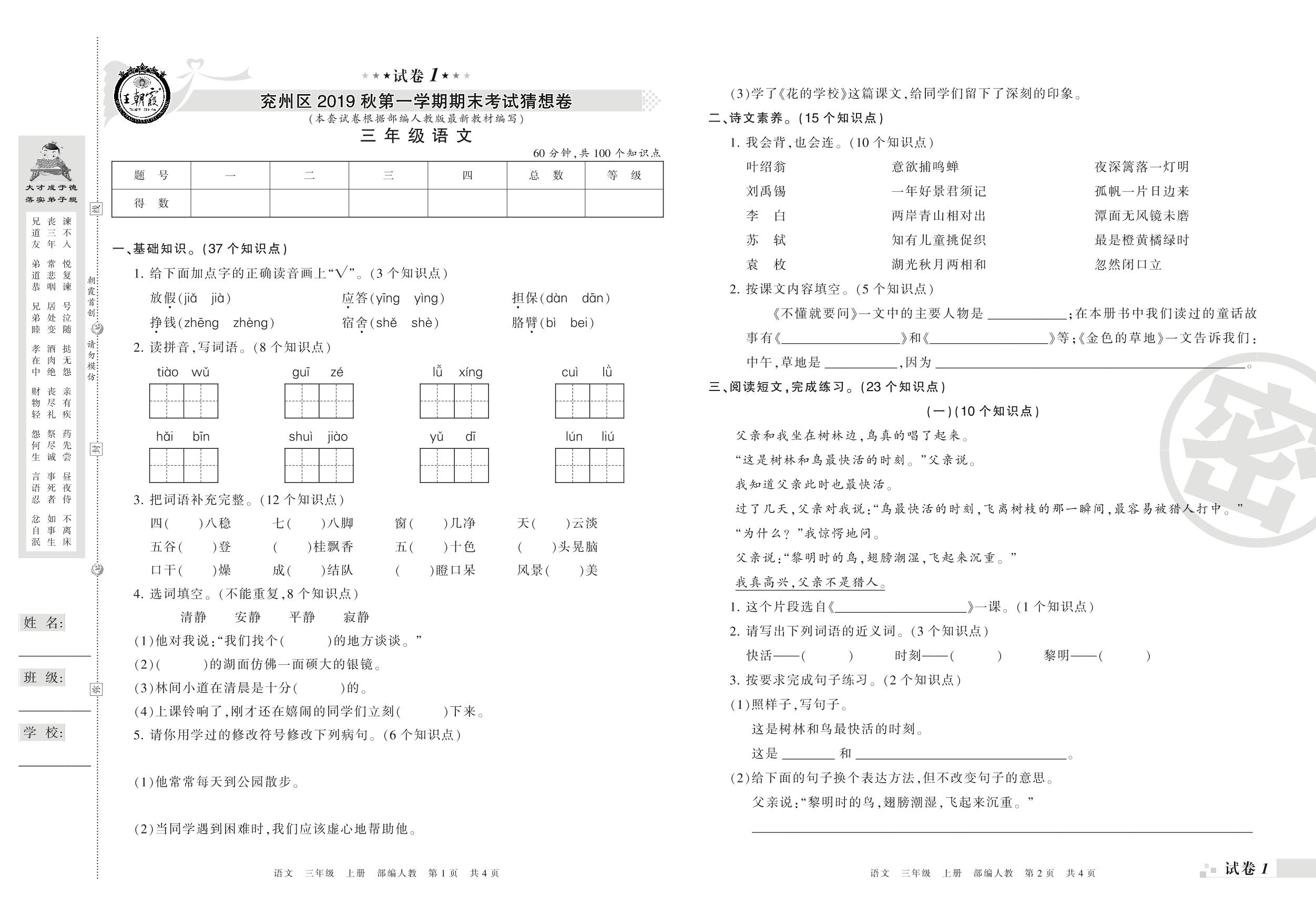 2018-2019学年第一学期济宁市兖州区猜想卷三年级语文试卷(人教版)【1】