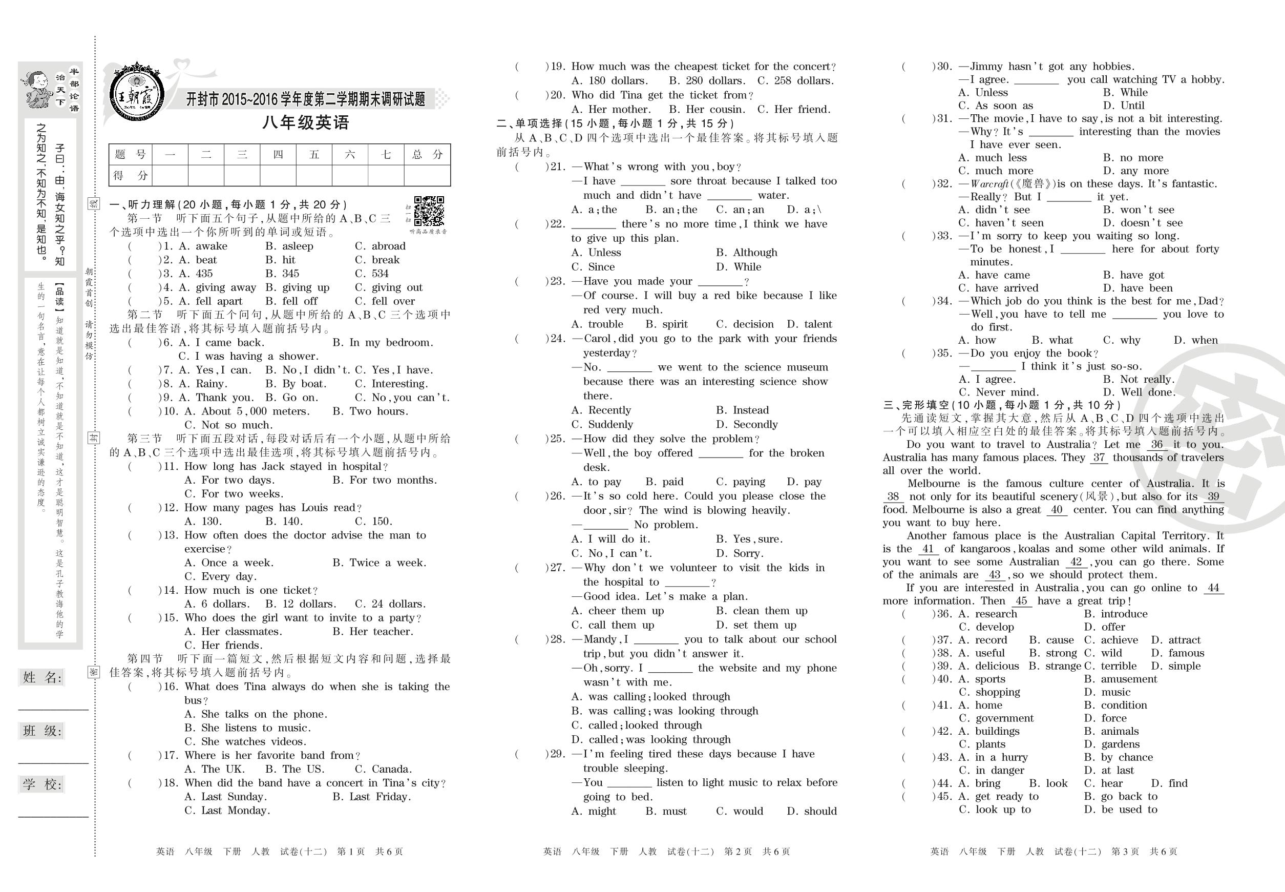 2015-2016学年第二学期开封市八年级英语试卷(人教版)【12】