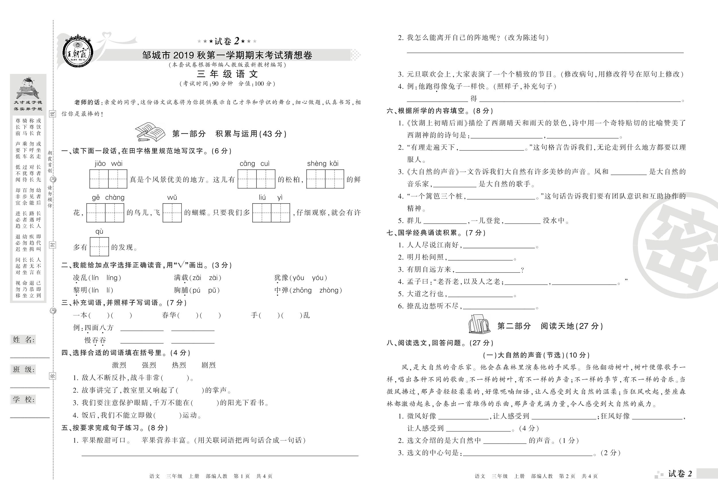 2018-2019学年第一学期邹城市猜想卷三年级语文试卷(人教版)【2】