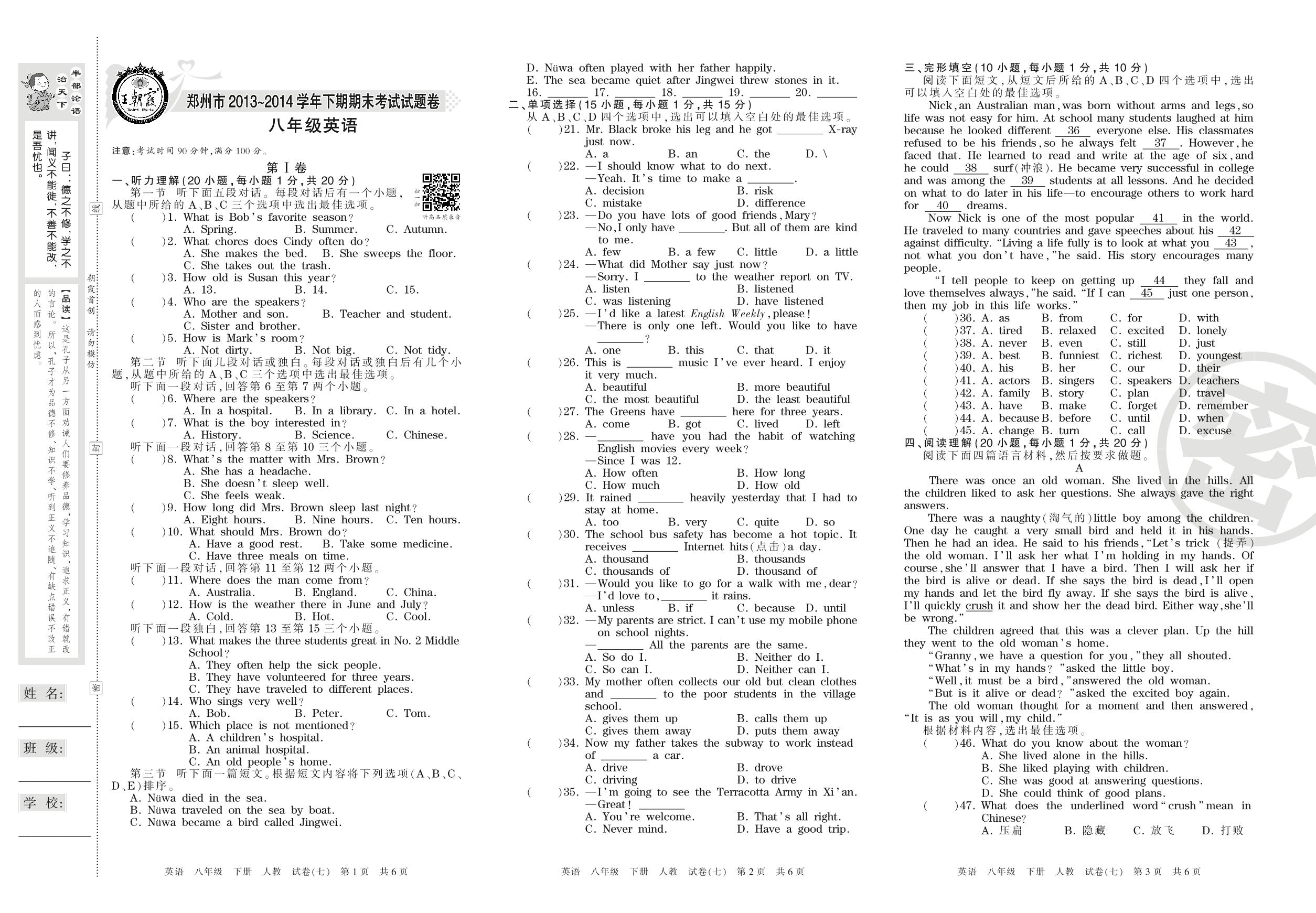 2013-2014学年第二学期郑州市八年级英语试卷(人教版)【7】