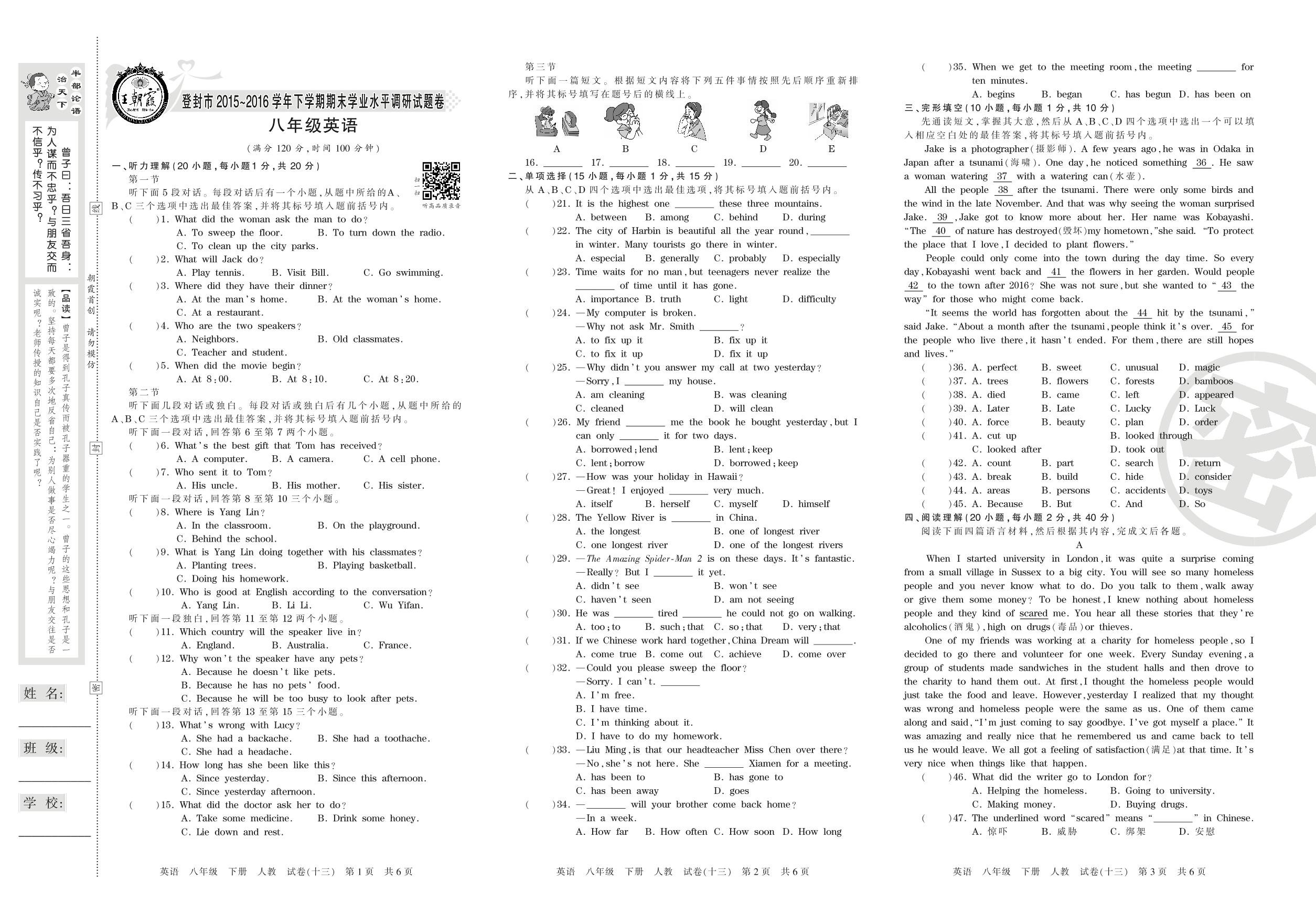 2015-2016学年第二学期登封市八年级英语试卷(人教版)【13】
