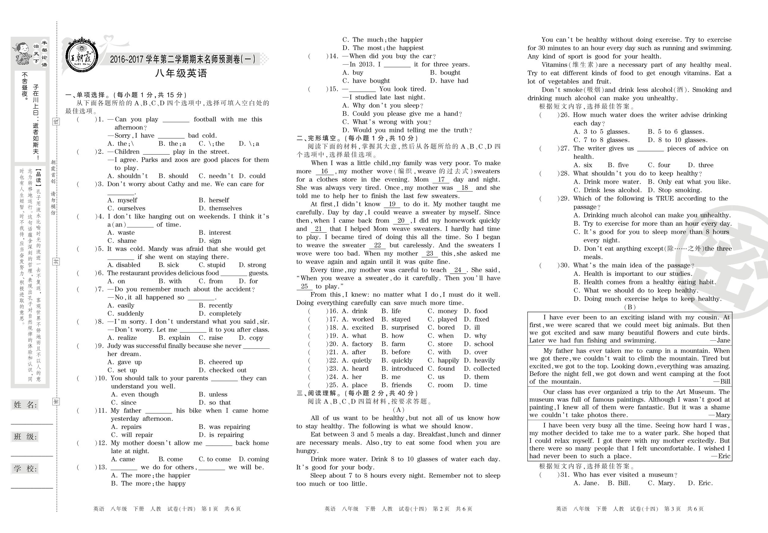 八年级英语人教版下册期末卷