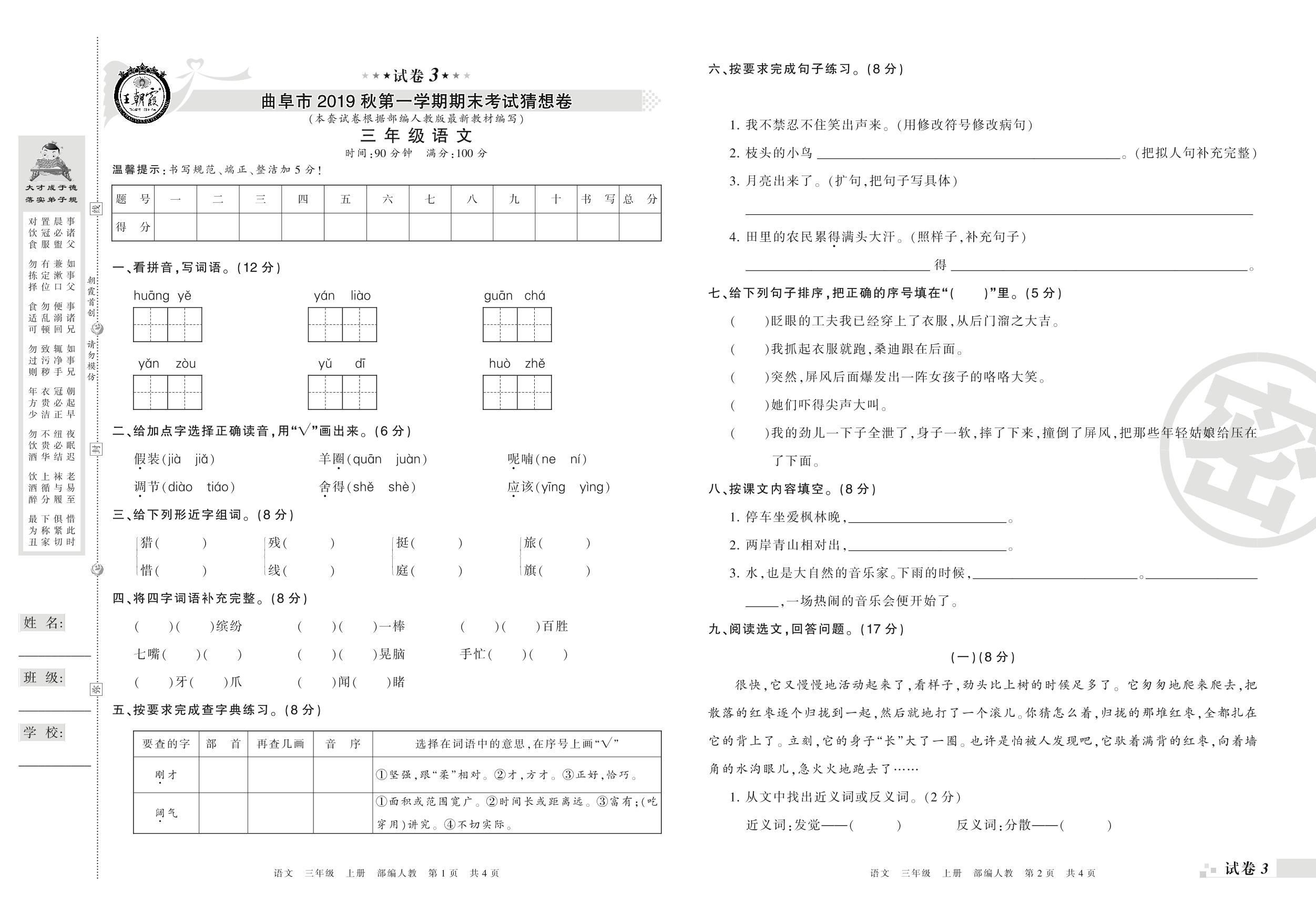 2018-2019学年第一学期曲阜市猜想卷三年级语文试卷(人教版)【3】