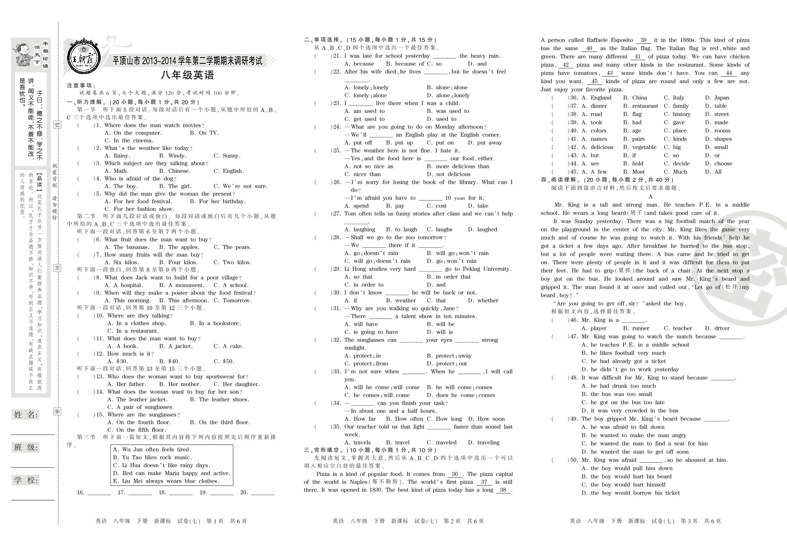 2013-2014学年第二学期平顶山市八年级英语试卷(新课版)【7】