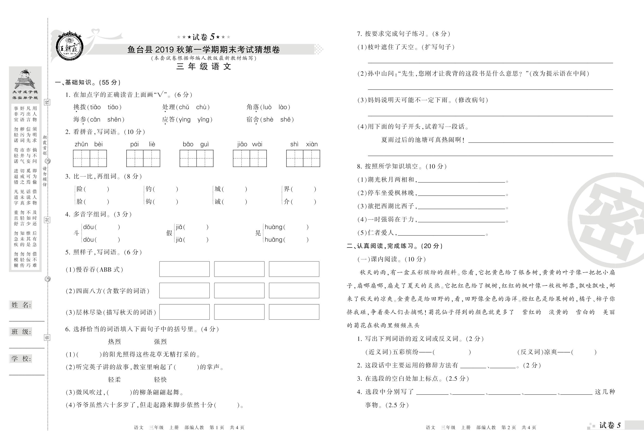 2018-2019学年第一学期济宁市鱼台县猜想卷三年级语文试卷(人教版)【5】