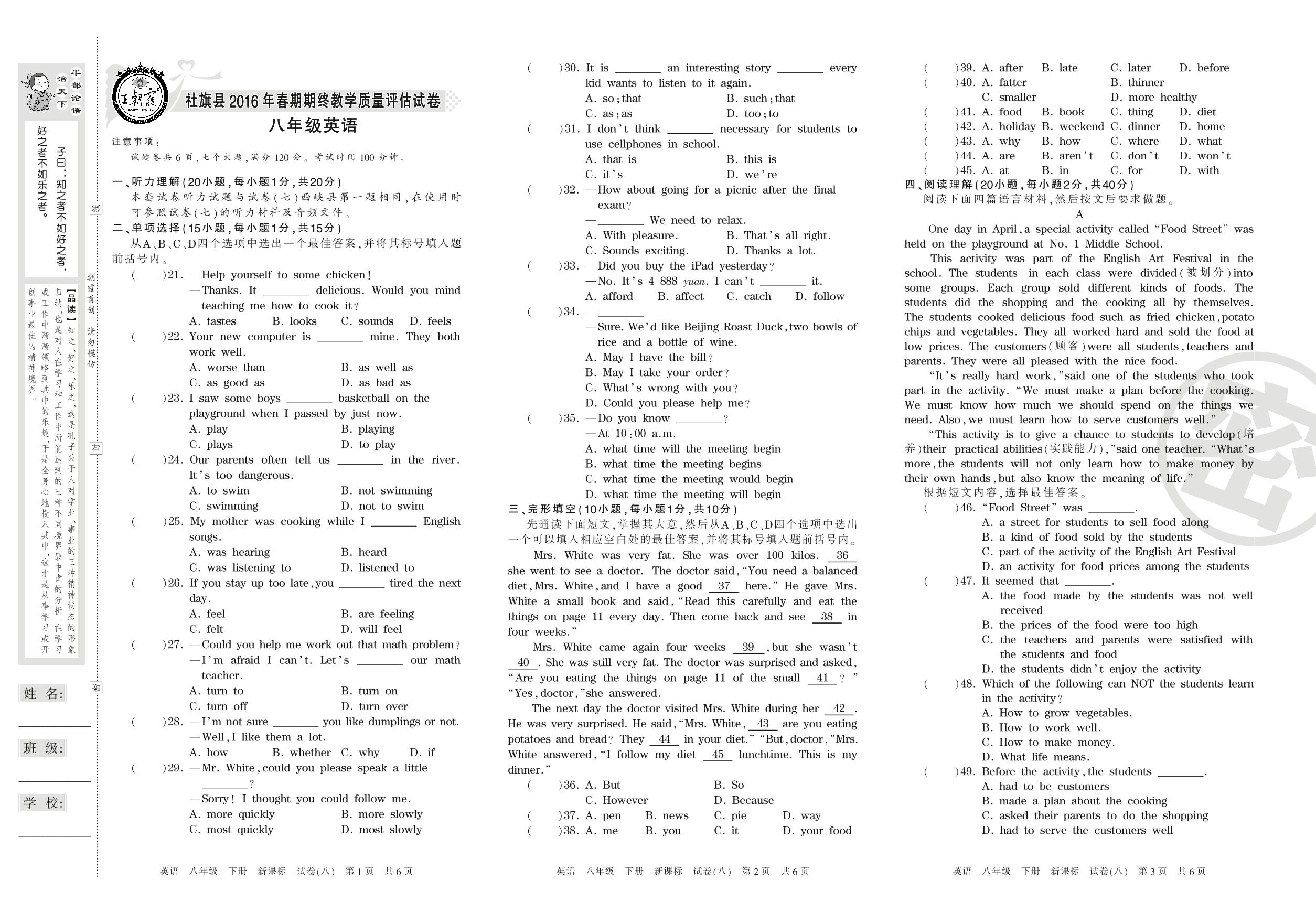 2015-2016学年第二学期南阳市社旗县八年级英语试卷(新课版)【8】