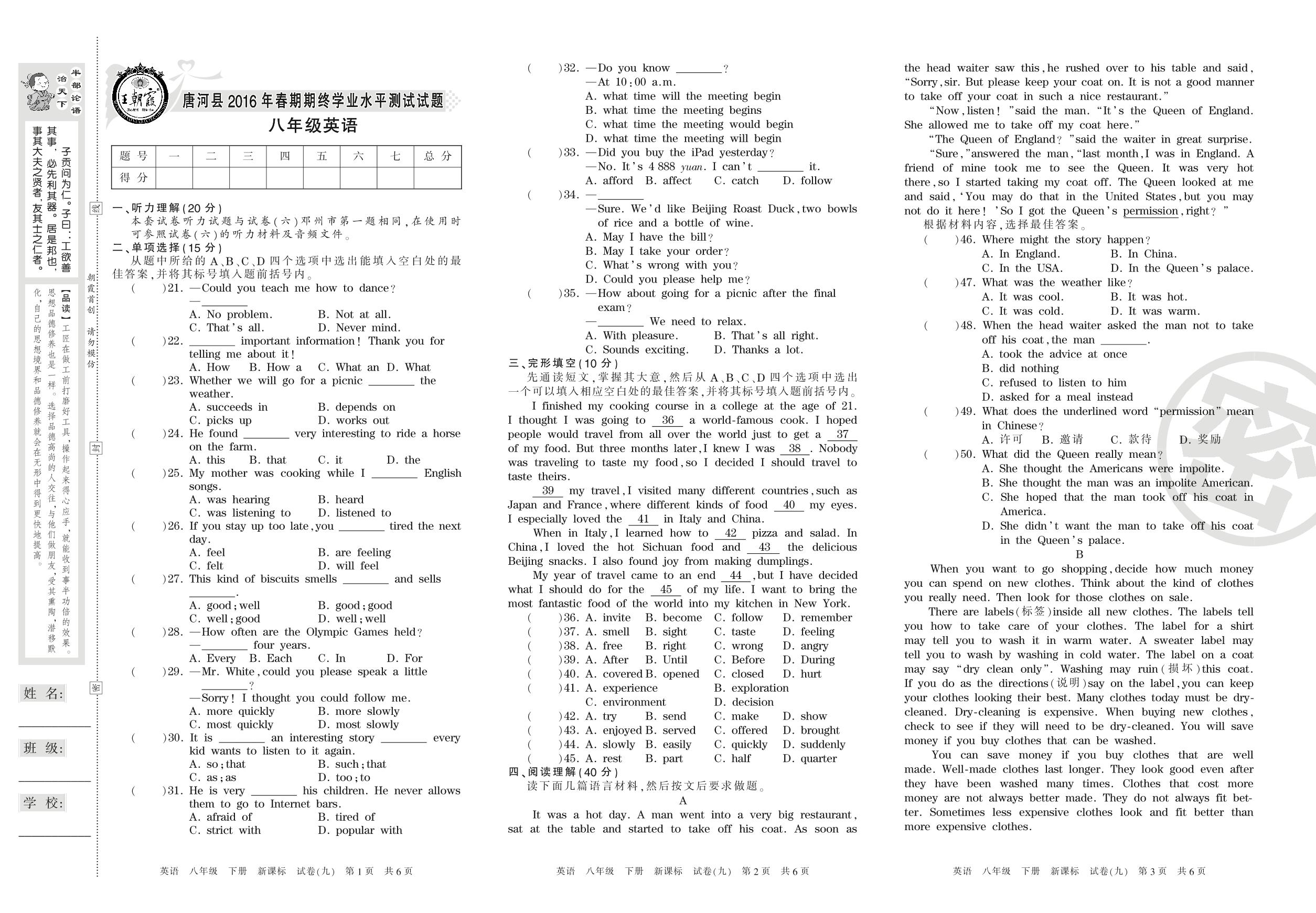 2015-2016学年第二学期南阳市唐河县八年级英语试卷(新课版)【9】