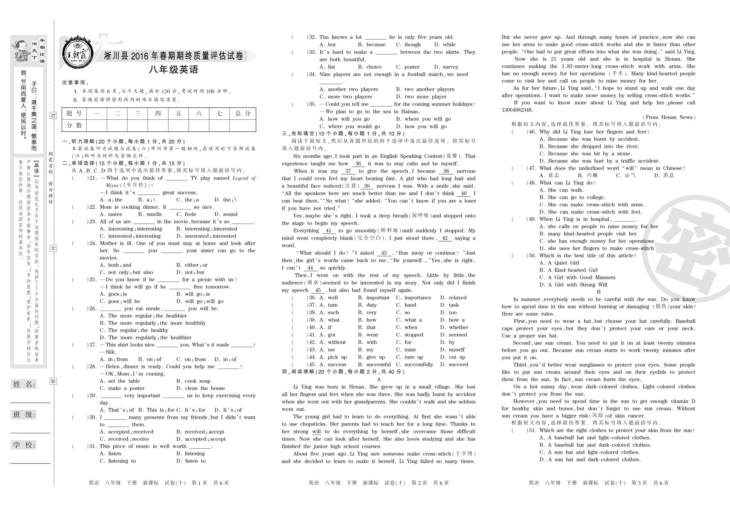 2015-2016学年第二学期南阳市淅川县八年级英语试卷(新课版)【10】