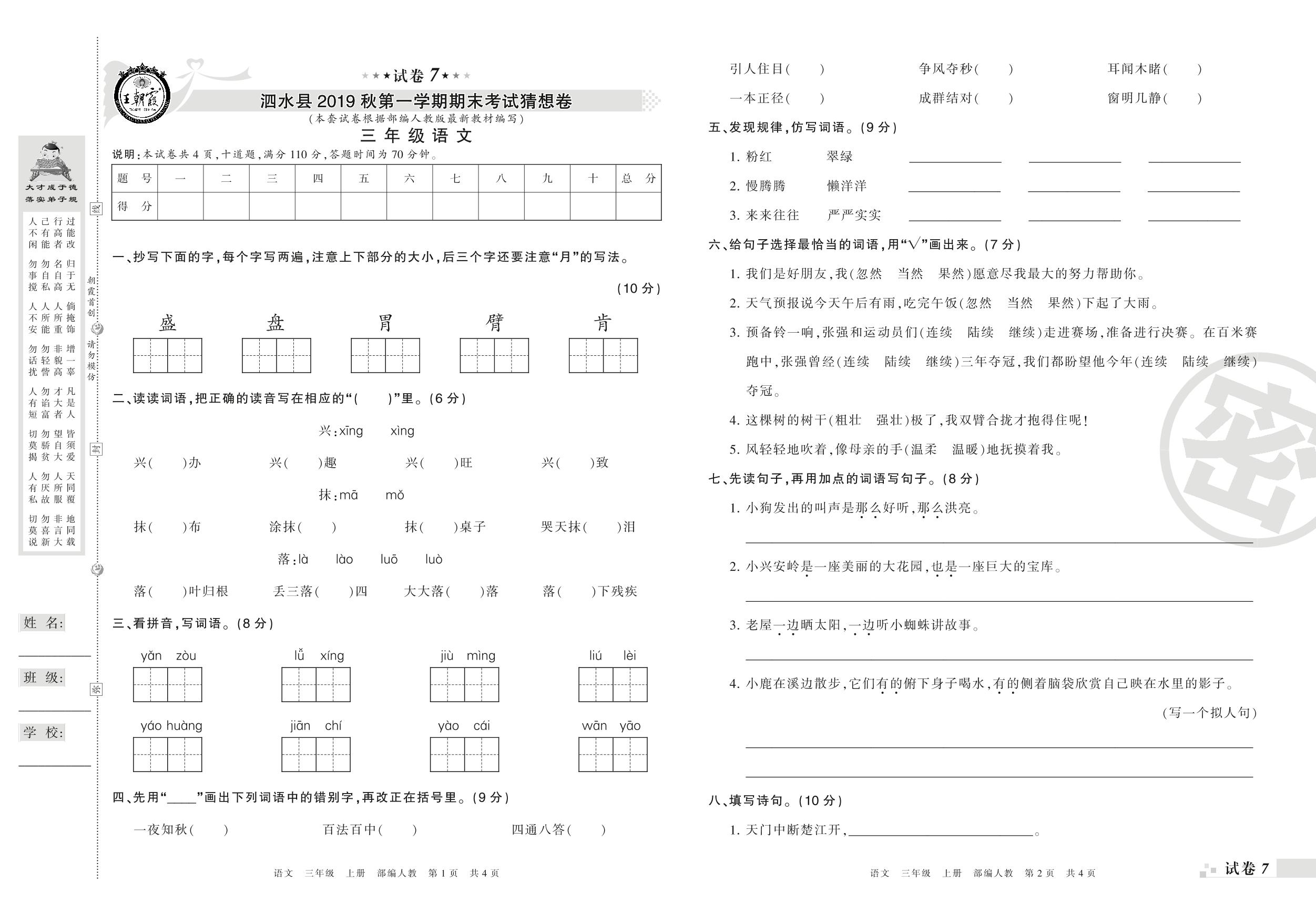 2018-2019学年第一学期济宁市泗水县猜想卷三年级语文试卷(人教版)【7】