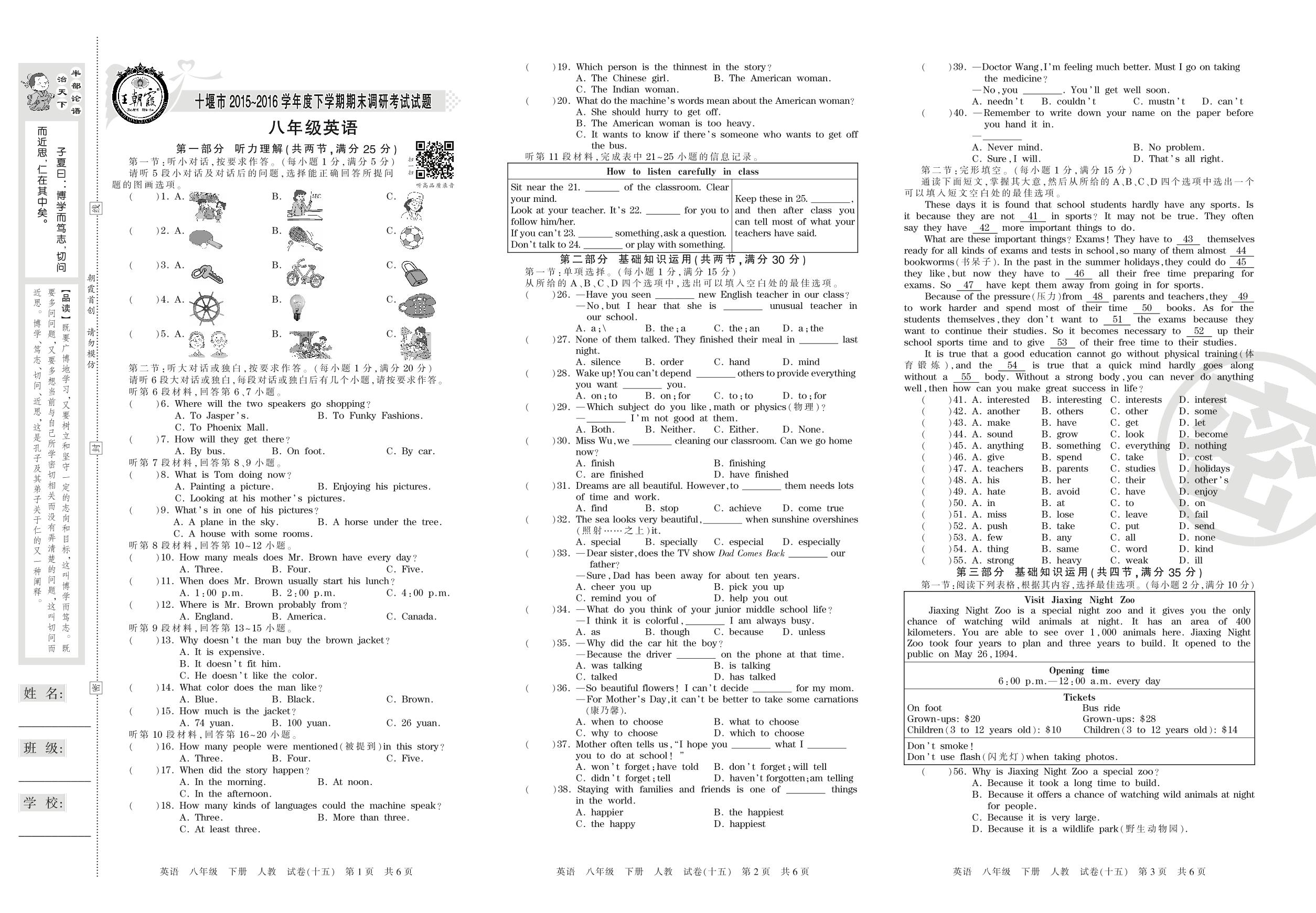 2015-2016学年第二学期十堰市八年级英语试卷(人教版)【15】