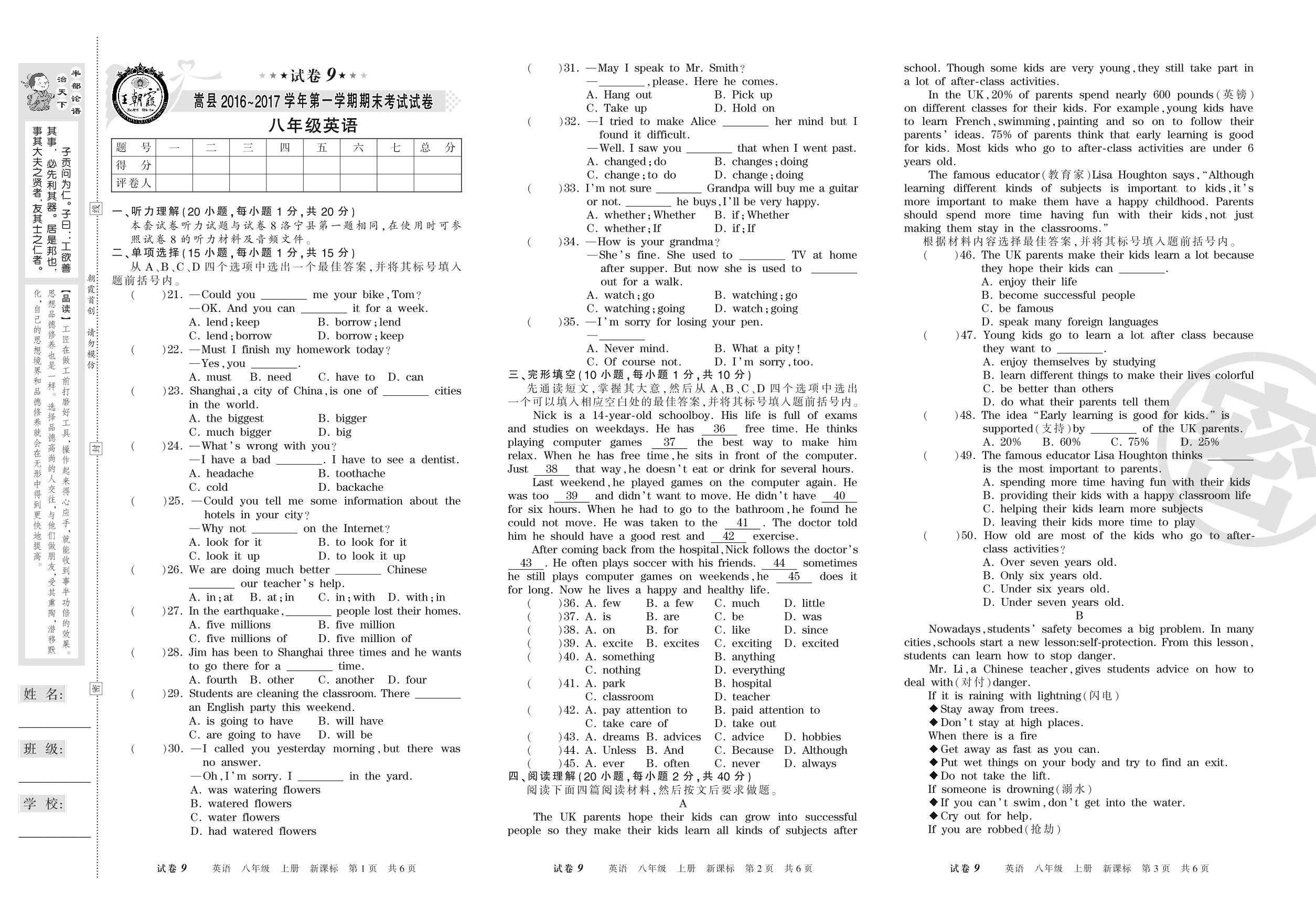 2016-2017学年第一学期洛阳市嵩县八年级英语试卷(新课版)【9】